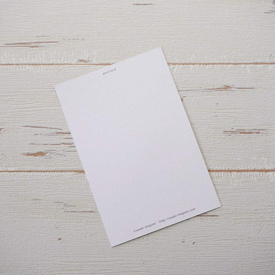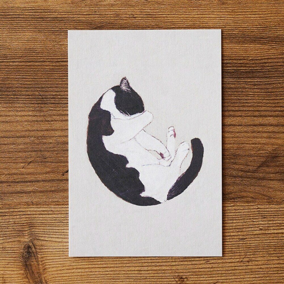 「人と会った時の話題のひとつになればいいな」という思いを込めて、動植物や食べ物、雑貨など身近なもののイラストを描いている、ささきめぐみさんのポストカードです。丸まって寝ているハチワレ猫です。
