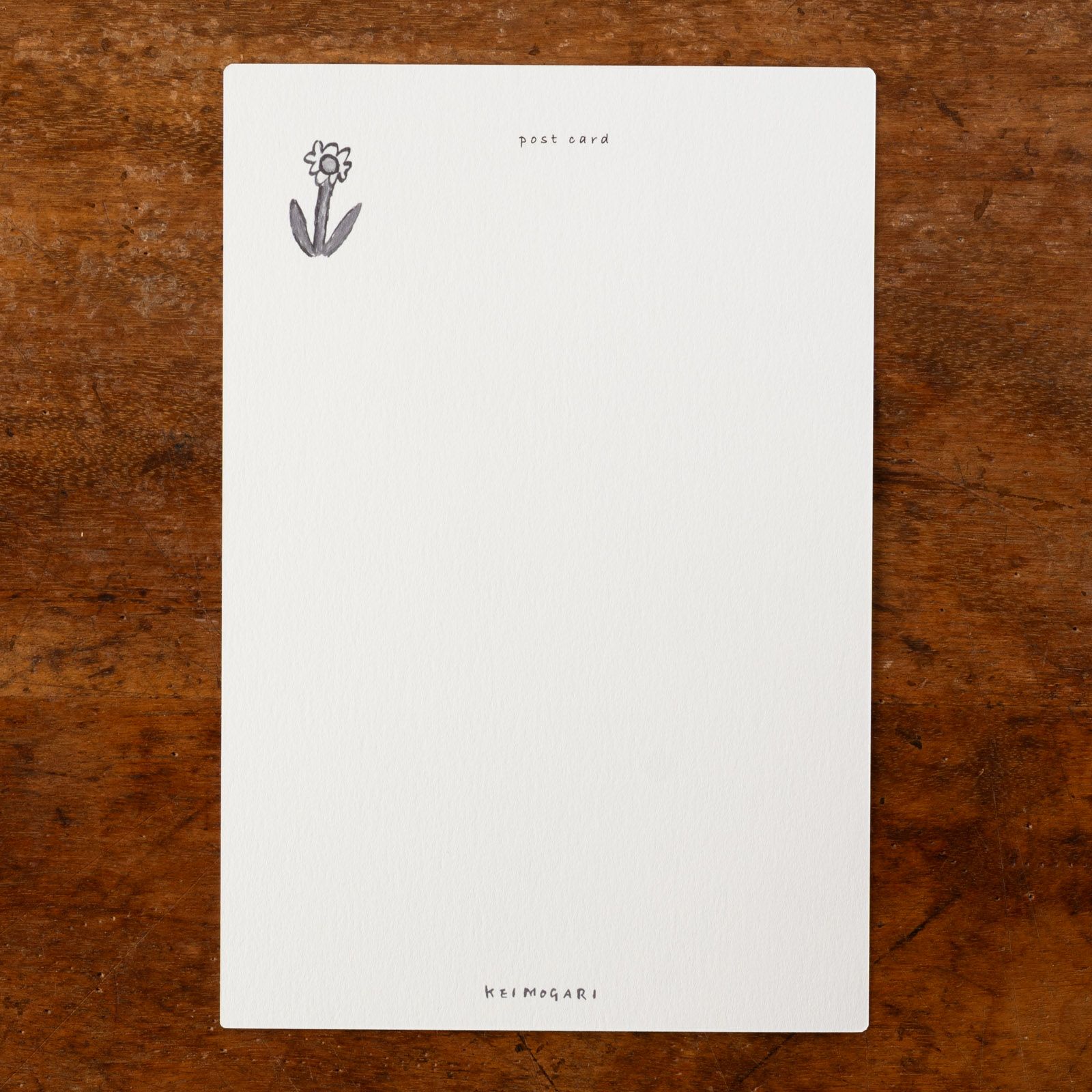 イラストレーター・茂苅恵さんが描く、絵本の1ページのようなポストカードです。手を繋いで歩くペンギンのところへ、黄色い“ちょう”が飛んできました。池には小さな魚が隠れていて、遊び心の効いた1枚です。