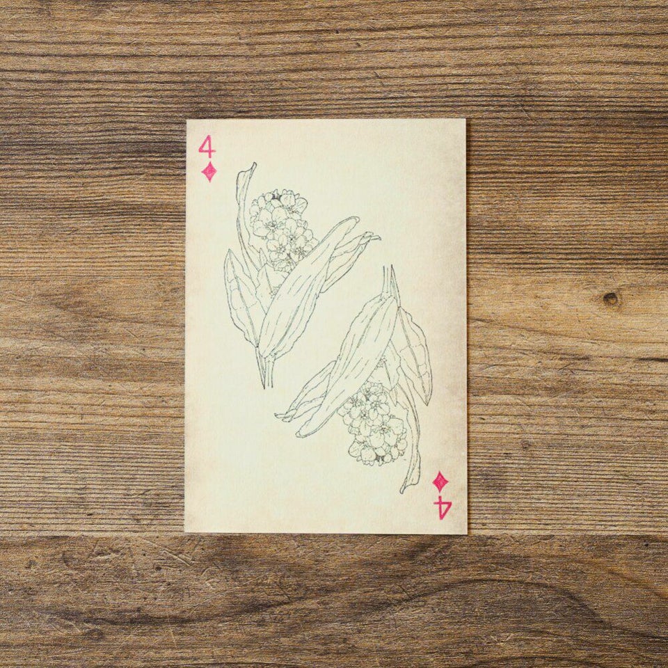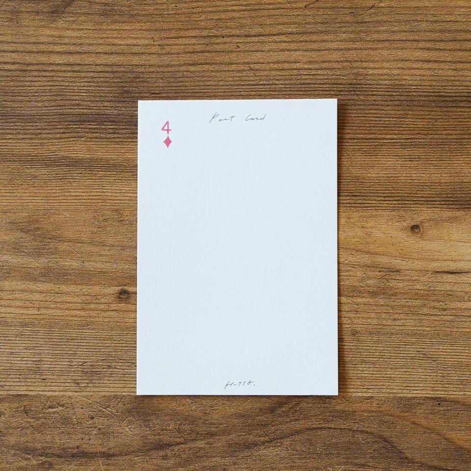 消しゴムはんこ作家HUTTE.さん。実際にご制作いただいたはんこと、風合いのよい古紙を組み合わせてデザインされています。イメージは[古いトランプカード]。久しぶりに開いた本の中に挟まっていたような、ポストを覗いて発見したら嬉しくなるような素敵なデザインです。