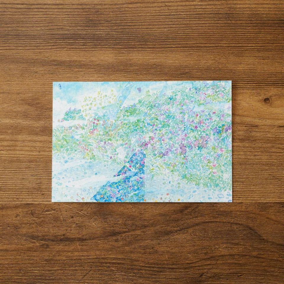 透明感のある色彩で、季節を運ぶ風や植物の香り、気持ちの変化などの目に見えないものを描き出す清水美紅さん。自分もその世界に入り込んでいるような気持ちになります。画材はアクリルガッシュ(水性アクリル絵具の一種)を使用されているとのこと。大切なお手紙として贈るのはもちろん、真っ白い壁に貼って自身でも楽しみたい。