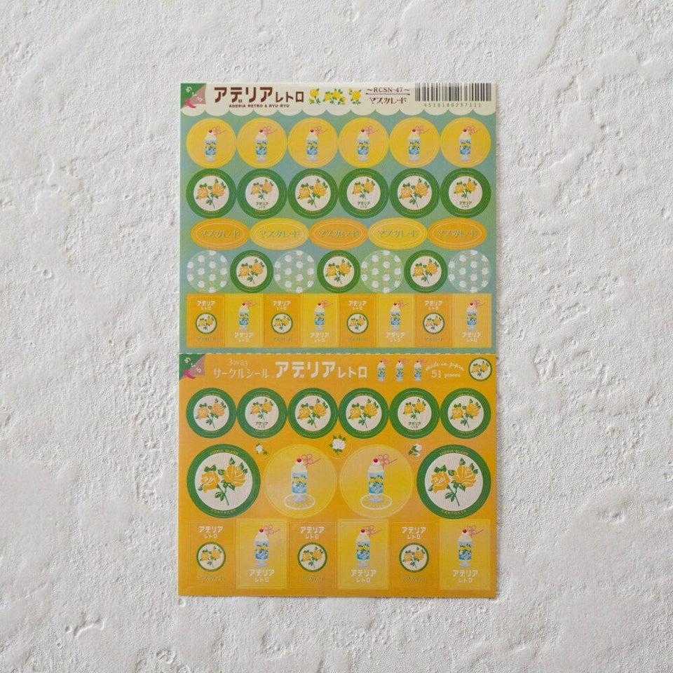 「アデリアレトロ」のグラスウェアをモチーフにしたサークルシールです。ロゴマークやパターン柄など、大小さまざまなシールがたっぷり51ピース入っています。シール台紙中央のミシン目で二つに切り離してシェアしたり、台紙裏面のスリットをはがせば手帳やノートに台紙ごと貼り付けたり、コンパクトに保管できる3wayサークルシールです。