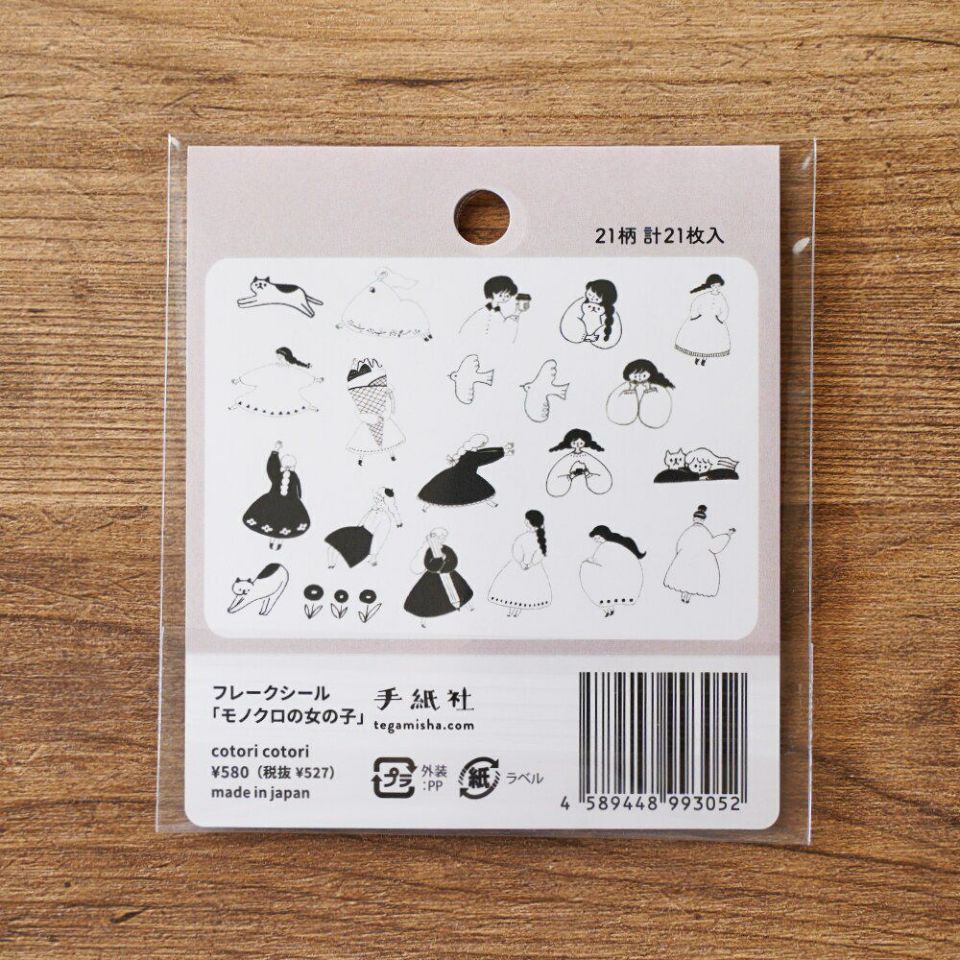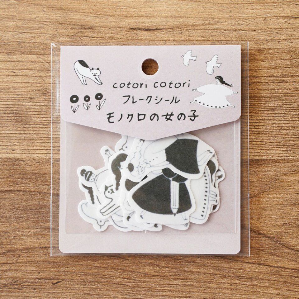 愛媛でオリジナルのゴム版はんこや紙雑貨を制作するcotori cotori。その代名詞である愛らしい女の子たちのデザインで、フレークシールを作っていただきました。モノクロのシールなので、どんな色のテープやシールにも合わせやすいです。少し大きめサイズですので、1枚貼るだけでも存在感抜群なのも嬉しいポイント。ねこや鳥のキュートな仕草お楽しみ下さい。和紙シールの柔らかな透け感もお楽しみいただけます。