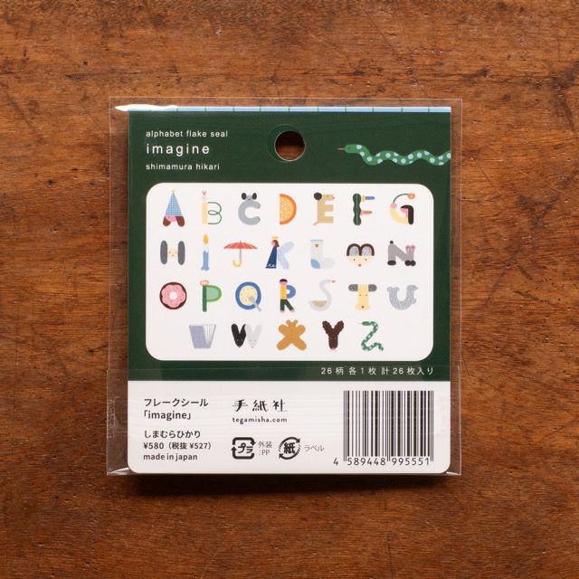 手紙社の雑誌『LETTERS 02』のために、イラストレーター・しまむらひかりさんが描きおろしてくれたアルファベットの絵がフレークシールになりました。タイトルは「imagine」。とんがり帽子にクリームシチュー、天使、つぶらな瞳の動物たち……。アルファベットのかたちから“想像”して描かれたさまざまなモチーフは、もちろんひとつでもかわいいけれど、並べたらもっとかわいい! 手帳やパソコンに貼っても良し、スマートフォンケースの中に入れても良し。どうやって使おうか想像をめぐらせるのも、きっと楽しい時間になりますよ。