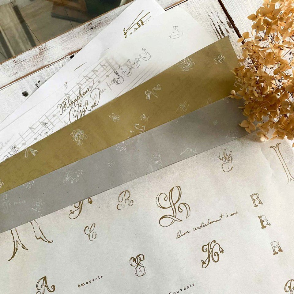 古いものや小さいもの、華奢で繊細なもの、色褪せた風合いやグレイッシュをキーワードに、アクセサリーや小物を手がける溝江里映さんによるブランド「Anano(アナノ)」。手紙社とのコラボレーションで、スペシャル感が漂う包装紙ができました。それぞれ、トレーシングペーパー・薄葉紙・純白ロールという、独特の風合いのある用紙を使っています。ゴールドインクが使われているものもあり、とっても豪華! 「フランスの蚤の市で見つけました」と言われたら信じてしまいそうな、異国の雰囲気が漂う5柄の包装紙です。そのままでももちろん、透け感を活かして無地の包装紙と重ねてラッピングしても素敵になりそう。黒や紺など濃いめの色と合わせると、シックにまとまりそうです。丁寧に包みを解いてくれるような、紙ものが大好きな方に贈りたい特別な包装紙です。