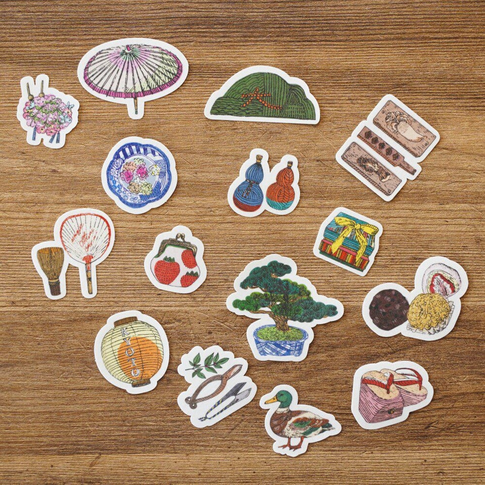 イラストレーター・いのうえ彩さんと制作した、フレークシールです。「KYOTO」をテーマに、おはぎや抹茶、京菓子、そしてがま口ポーチ。このシールのために15のモチーフを描き下ろしてくださいました。旅の記録ノートに貼ったり、ポストカードに添えてお手紙を出してみたり。思い出の装飾として、いかがでしょうか。