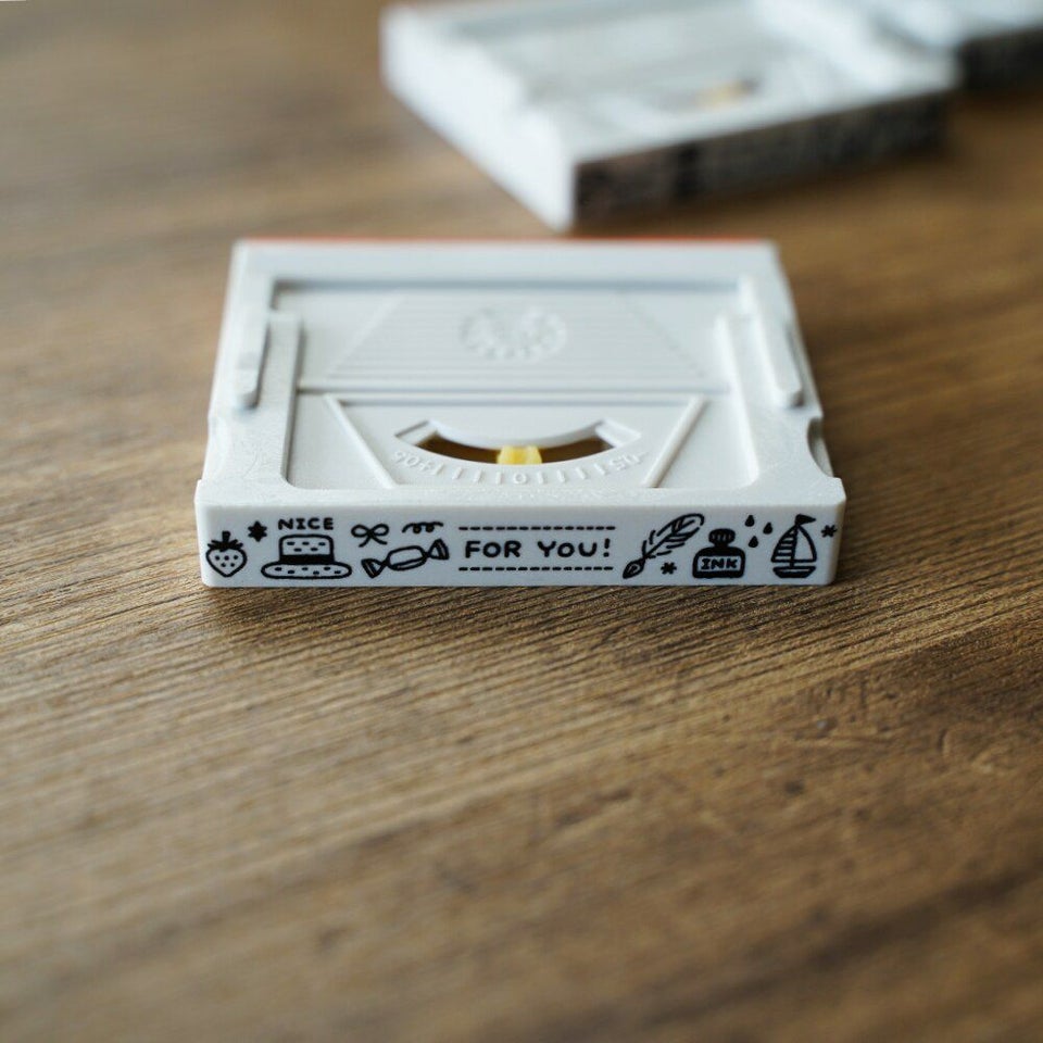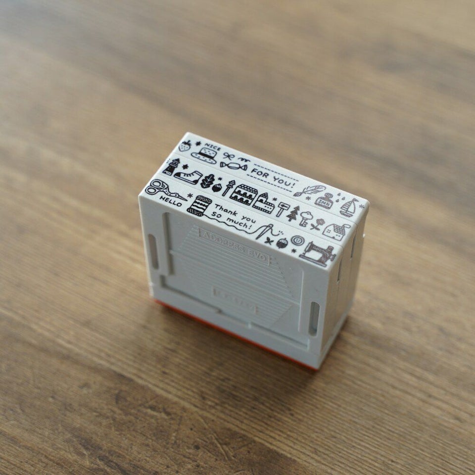 「FOR YOU」のメッセージと、麦わら帽子やヨットなど夏らしいモチーフが描かれています。横長サイズなので、マスキングテープのようにライン状に捺したり、ふせんやカードをちょこっと飾るのにもおすすめです。小さくて愛くるしいモチーフを楽しんでもらえたら嬉しいです。紙箱に捺したりラッピングなどにもおすすめです。