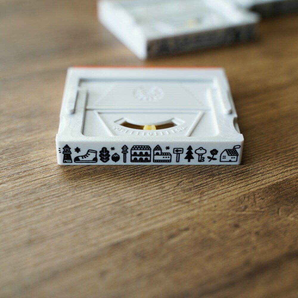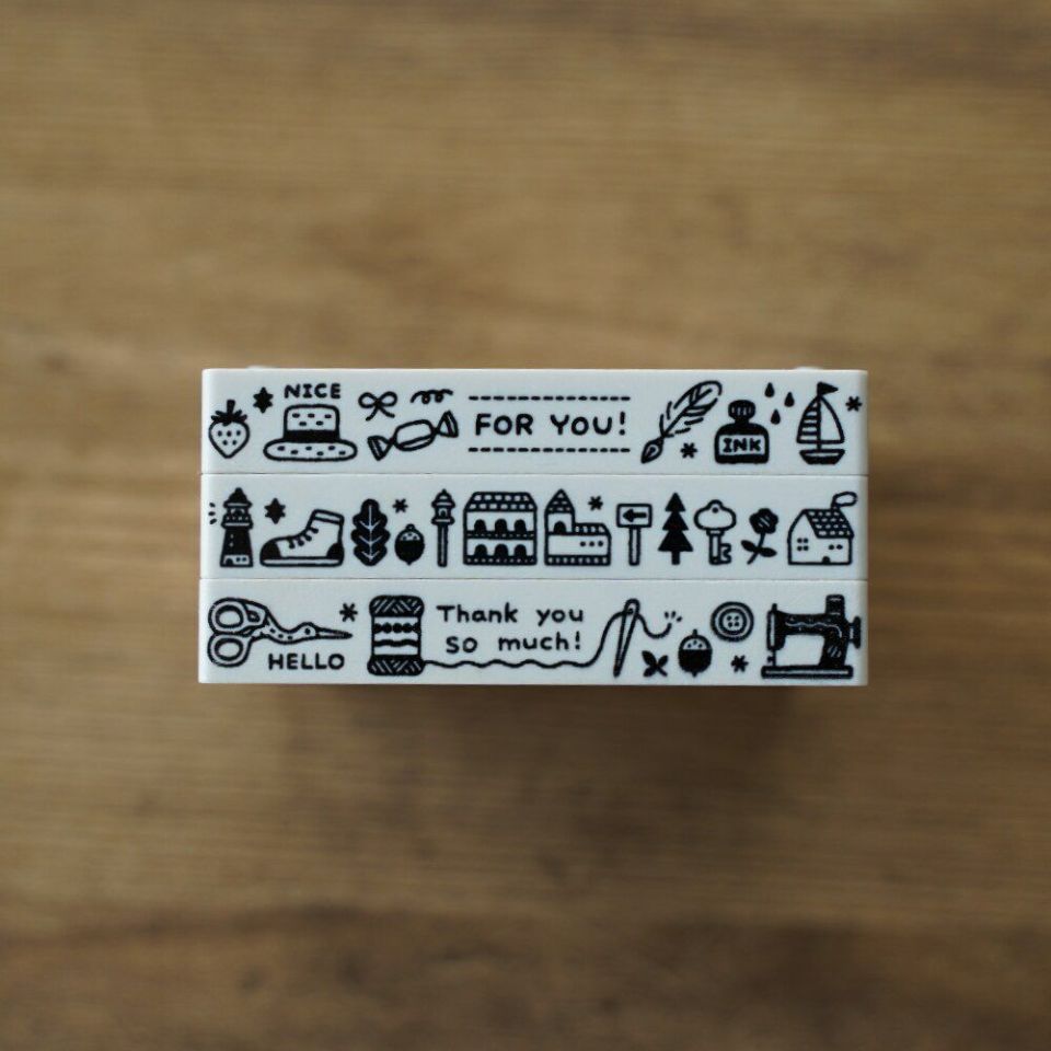 街の風景とスニーカーやカギなど、お出かけする時のアイテムも描き込まれてたデザイン。横長サイズなので、マスキングテープのようにライン状に捺したり、ふせんやカードをちょこっと飾るのにもおすすめです。小さくて愛くるしいモチーフを楽しんでもらえたら嬉しいです。