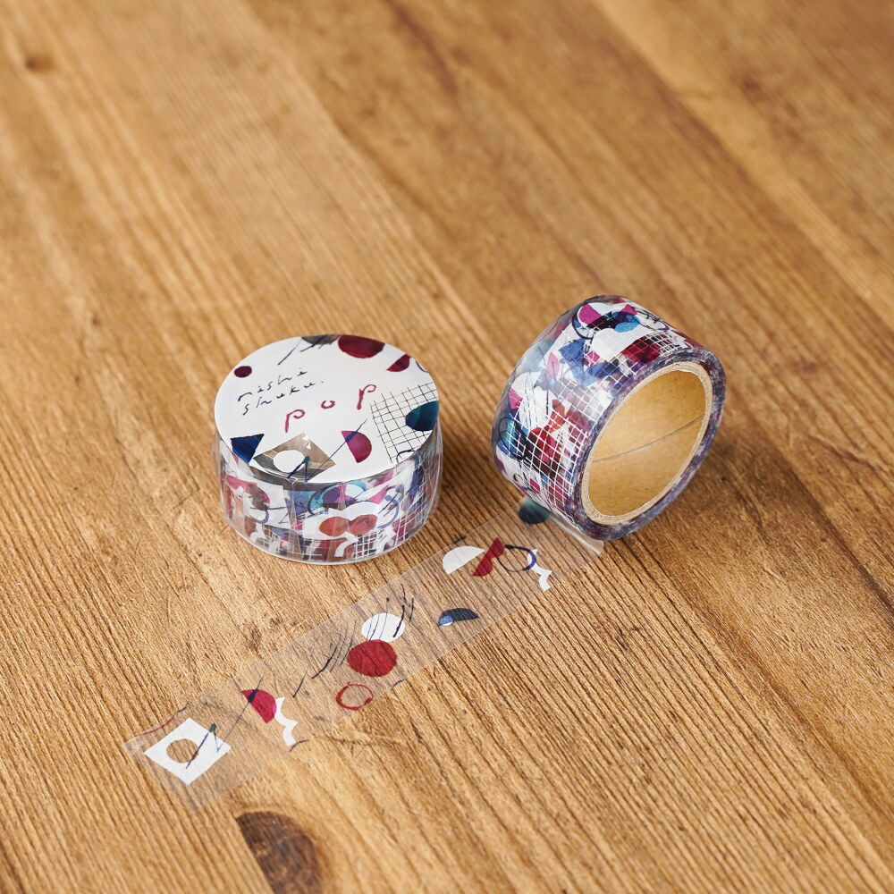 イラストレーター・西淑さんデザインの透明マスキングテープ。ぽこぽことした模様とシンプルな色使いがポップでかわいいデザイン。背景が透明なので、手帳などにもよく馴染みます。