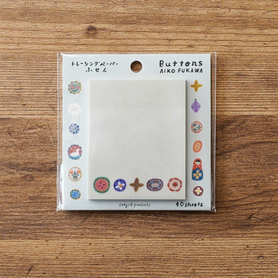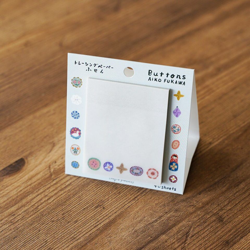 イラストレーター・布川愛子デザインのかわいいトレーシングペーパーふせん。まるでひとつひとつがブローチのような、いろんな色形のかわいいボタンが描かれています。