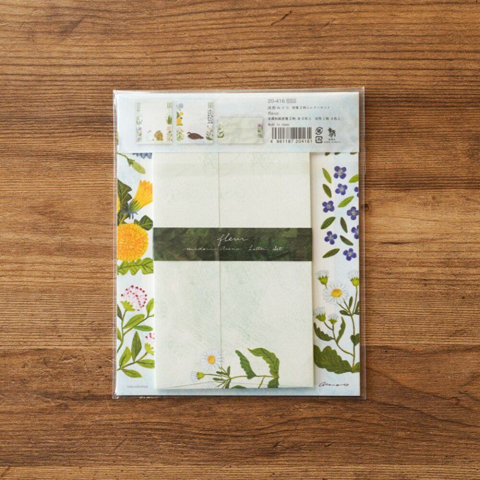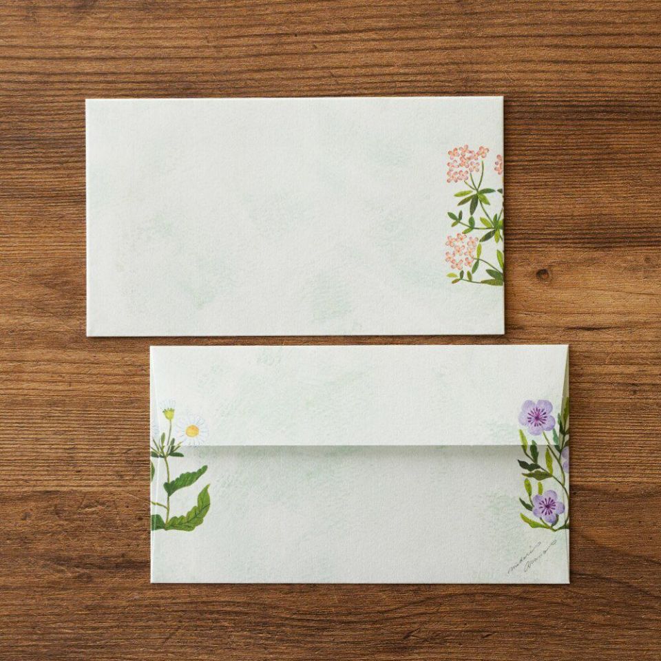 丁寧に描かれた草花や小動物がなんともかわいい、浅野みどりさんのレターセット。眺めていると、緑あふれるお庭にいるような心地に。受け取った相手もほっこり心癒されるようなお手紙が書けそうです。花柄ですが、緑と水色がベースの落ち着いた色づかいで、甘くなりすぎないのも使いやすいポイントです。季節のお便りにもおすすめ。