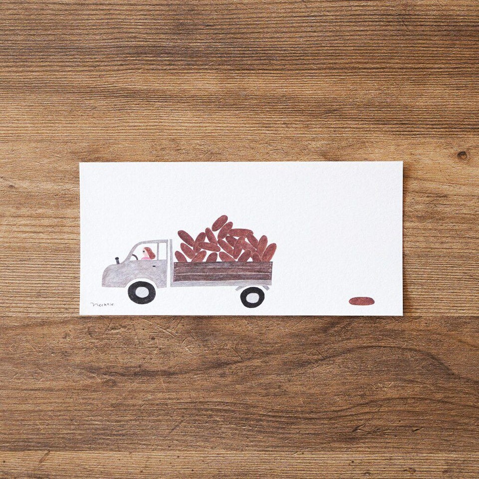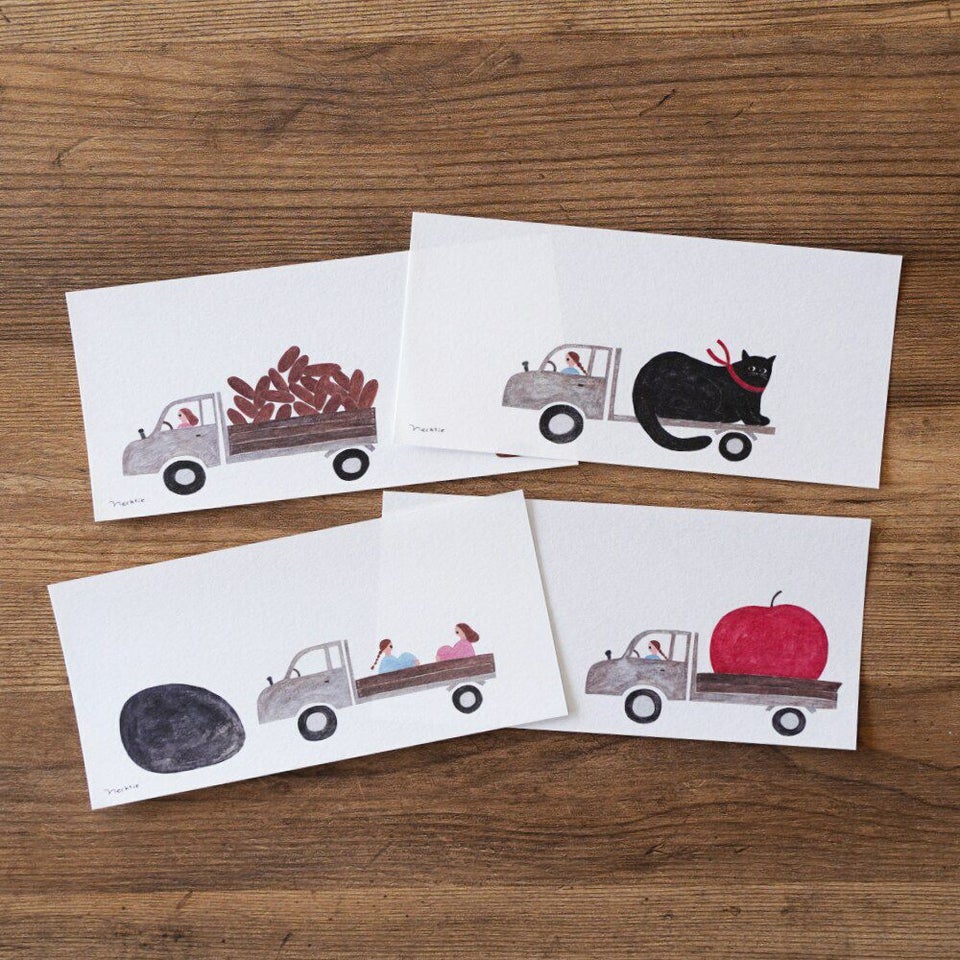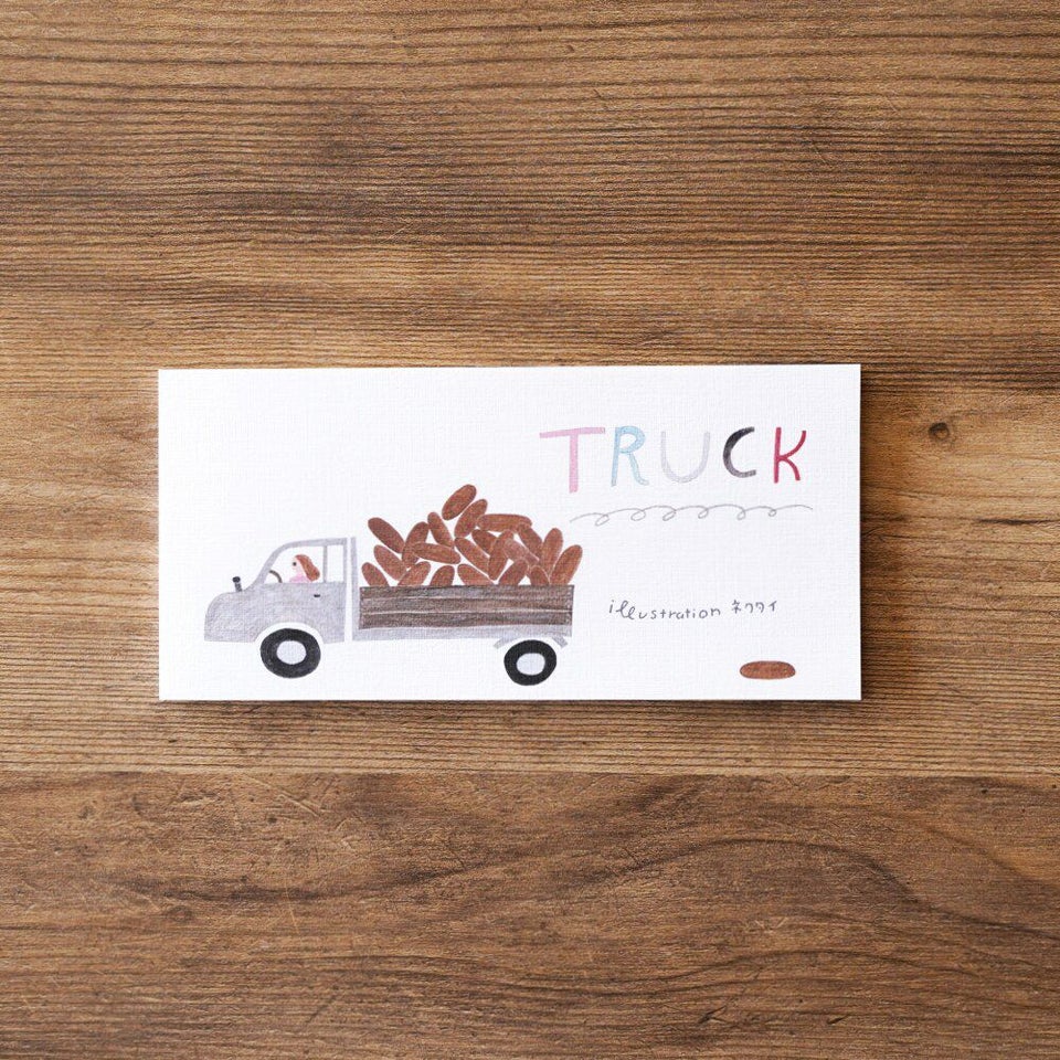 いろいろなものを運ぶトラック。大きな大きなりんご、コッペパン、ねこ…! メッセージを書けば、あなたの想いや気持ちもトラックが運んでくれますよ。