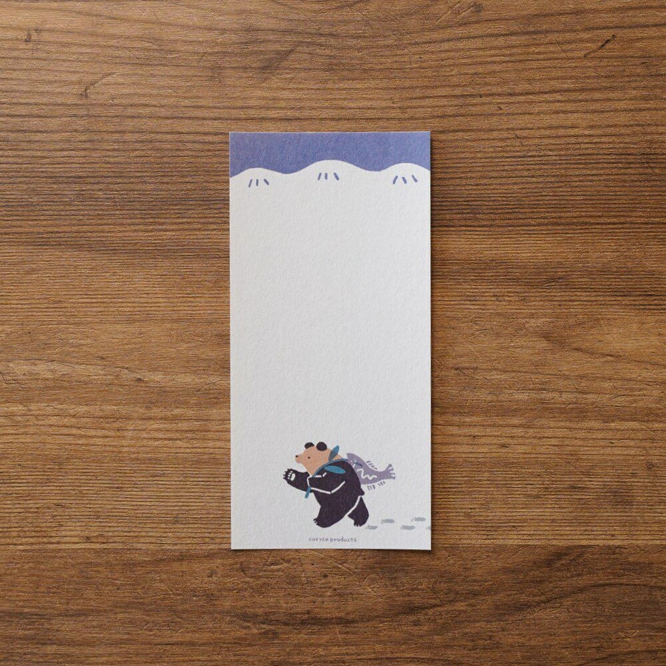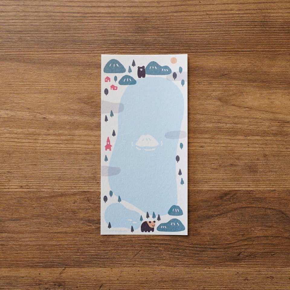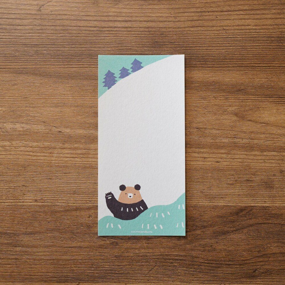 森をのしのし歩いたり、おおきなシャケを抱えた、やわらかな輪郭のくまさんがかわいい、高旗将雄さんデザインの一筆箋。お礼を書いたり、ちょっとした便箋としてお使いいただけます。