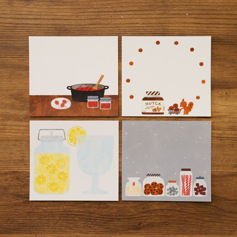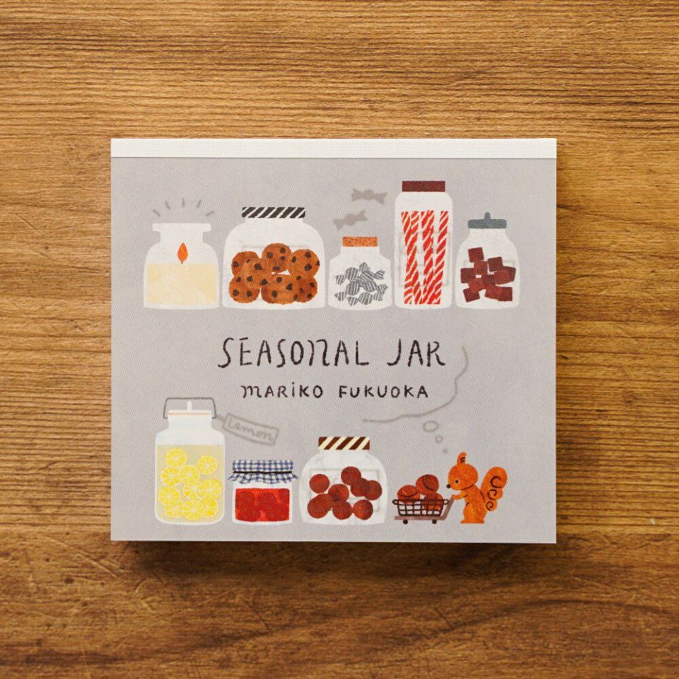 春はいちごジャム、夏はレモネード、秋はナッツのぽってりしたクリーム、冬はお菓子にキャンドル。瓶詰めをモチーフに季節の移り変わりが描かれた、かわいいブロックメモです。