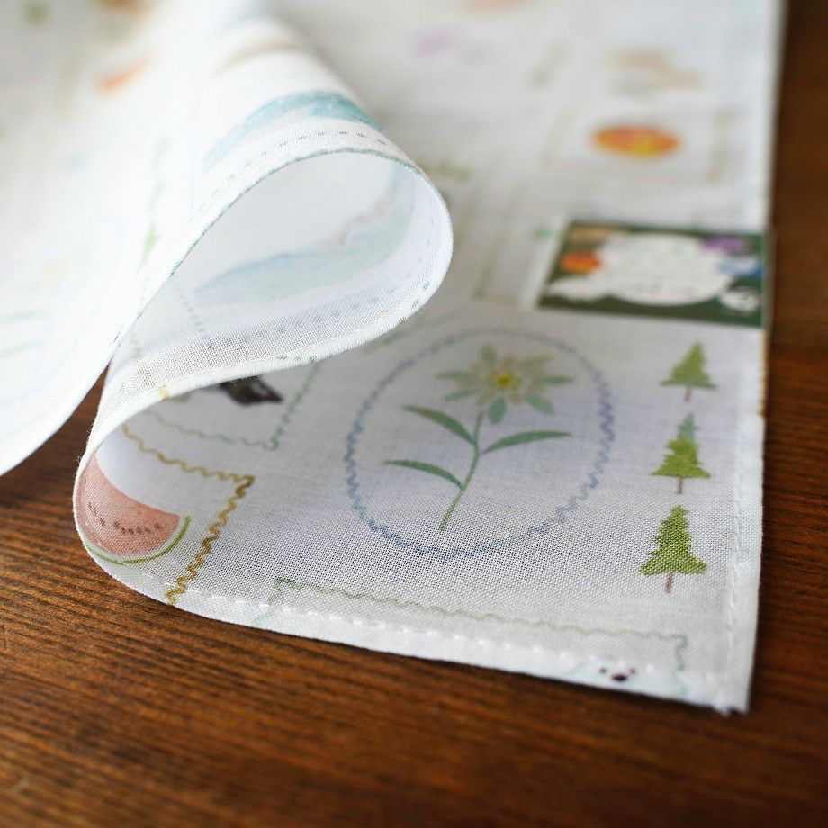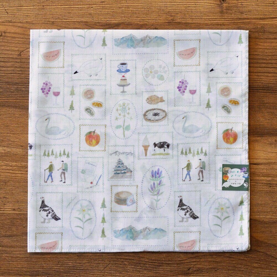 デザインは、長野県や松本市にちなんだモチーフを散りばめたもの。ライチョウやりんごなどの名物から、温泉の桶や喫茶店メニューまで様々な図案が優しい水彩で描かれています。是非ひとつひとつ探してみて下さいね。柔らかな手触りの大きめサイズハンカチ。お出かけのお供にいかがでしょうか。