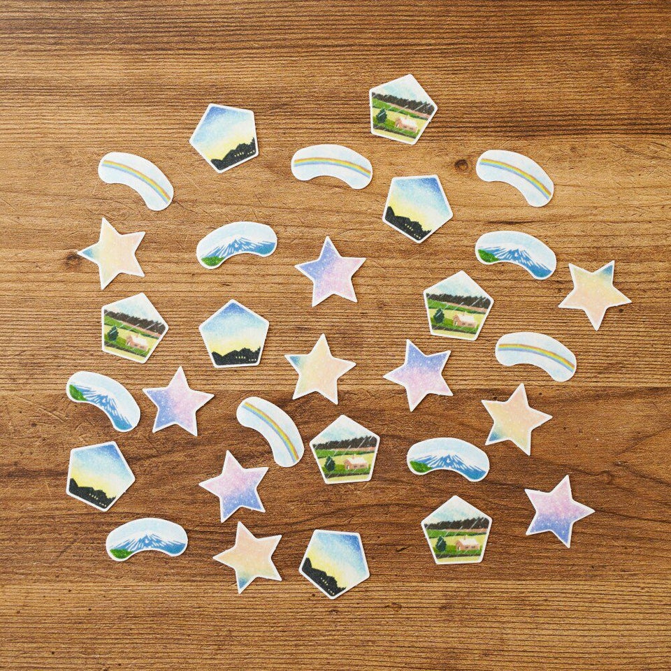 海や山、空、町並みなど、静けさと美しさが宿る作品を、版画で表現する平岡瞳さん。平岡さんが旅先や日常で見つめた風景がぎゅっとつまったシールができました。星や五角形、虹や富士山をかたどった楕円形。楽しい形で切り取られた風景のシールは、1枚貼るだけでもパッと美しく、彩りをもたらしてくれます。