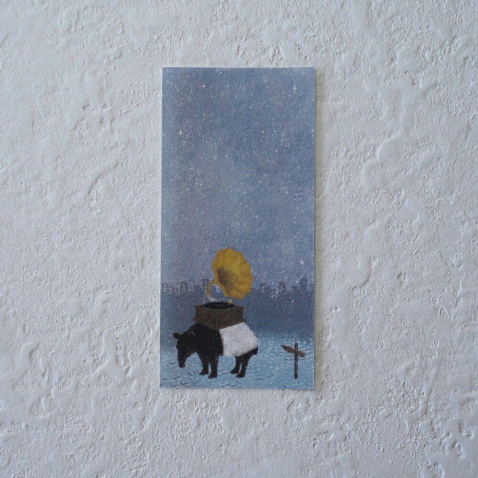 日下明さんの一筆箋。蓄音機、チューバ、アコーディオン、チェロ。メロディを奏でる楽器と動物たちが描かれています。どんな旋律を奏でているのか、想像がふくらむイラストたち。季節によって、使う柄を選ぶのも楽しいですよ。