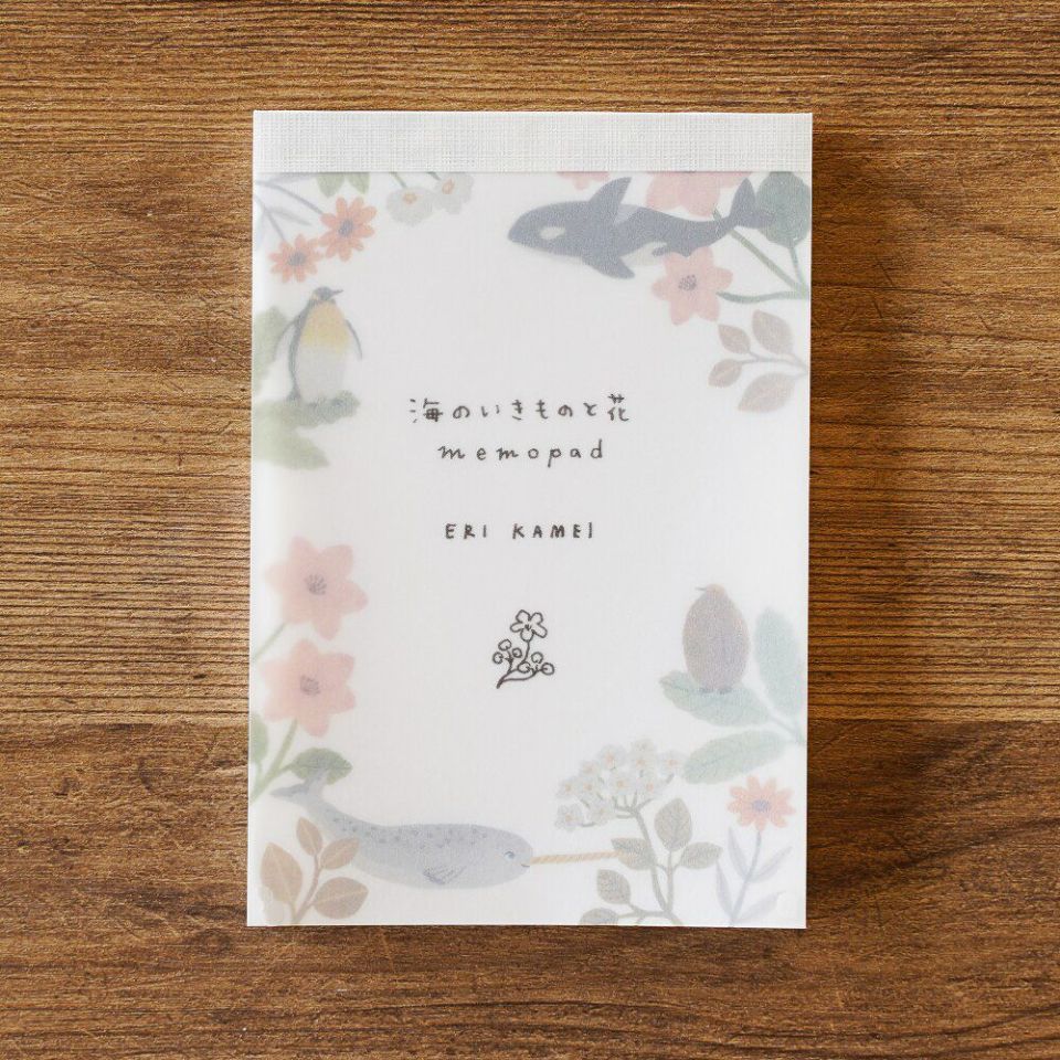 広告や雑貨、CM・パッケージなど、幅広い分野でご活動中の亀井英里さん。海のいきものとお花という、少し珍しい・でも絶対に可愛い組み合わせをテーマに新作メモパッドをご制作いただきました! 葉っぱの上のペンギン親子や、スイスイ泳ぐシャチとイッカクが、お花たちとベストマッチ!トレーシングペーパーの表紙に書かれた亀井さんの手書き文字も可愛く、重なった際の透け感もお楽しみ下さい。少しざらざらした風合いのある紙を使用しています。お揃いのロールふせん・マスキングテープも新登場しておりますので、ぜひご覧下さい。