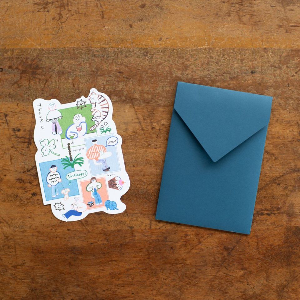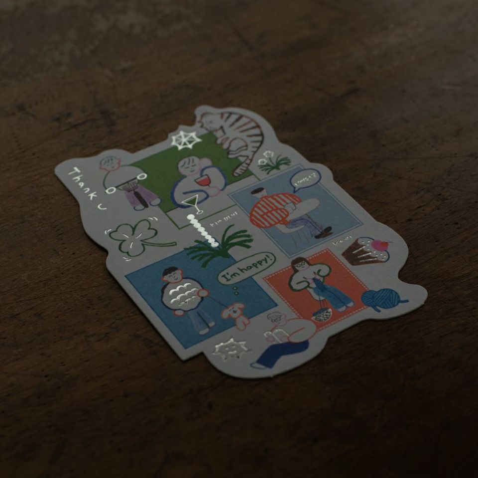 韓国語で「ハサミ」を意味するkawi。大切な人への贈りものを、よりいっそう輝かせる紙ものを制作しています。イラストレーターのキム・ブルーさんとkawiがコラボレーションして制作した包装紙がメッセージカードに。「幸せな1日」をテーマに描かれたイラストには、犬の散歩をしたり、コーヒーを飲んだり、読書をしたり、作家自身のやりたいことが詰め込まれています。カラフルな色づかいの中にさりげなく光るシルバーの箔押し加工がポイントです。
