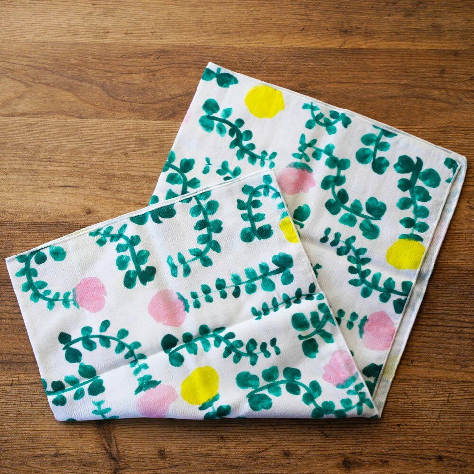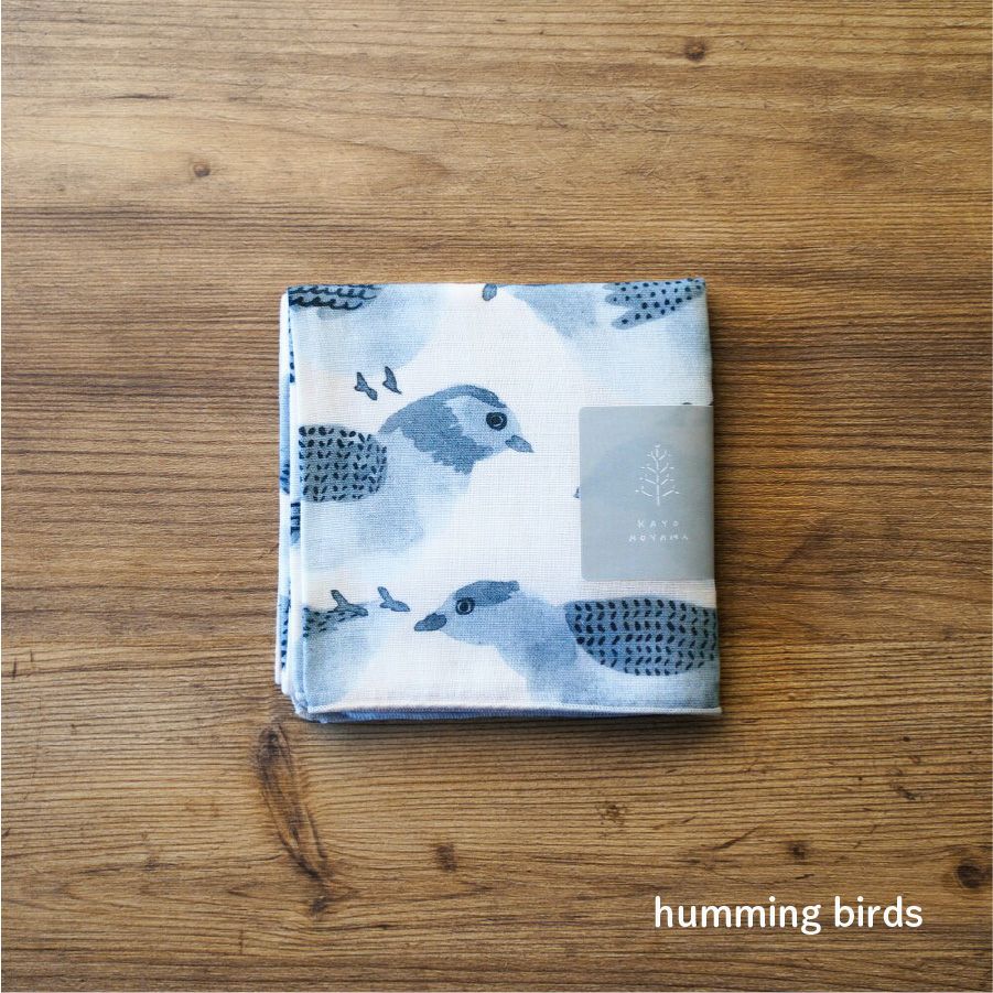 テキスタイルデザイナー・青山佳世さんの図案を、色のにじみや線の揺らぎをそのままに、肌触りの良いコットン100%のダブルガーゼ生地にプリントしたハンカチ。