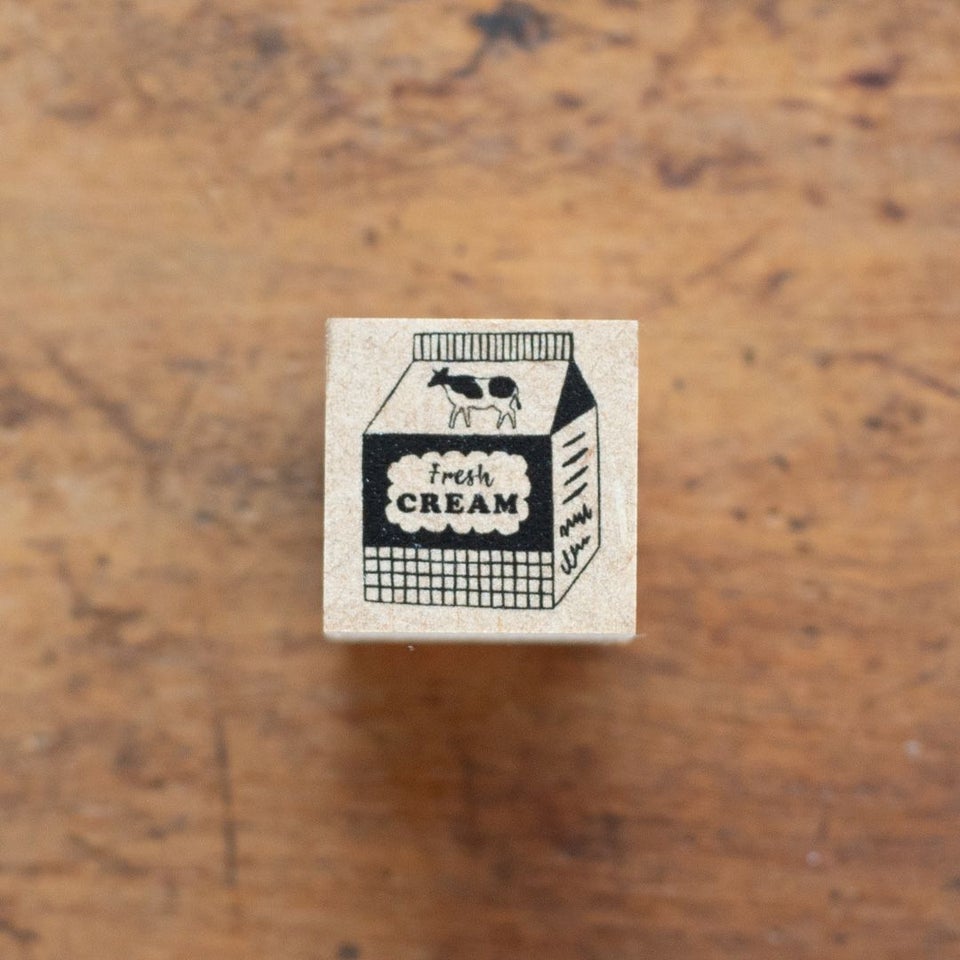 絵から切り取ったモチーフや手描きのイラストをもとに、ラバースタンプを制作するKinotoricoさん。こちらは海外のスーパーマーケットに並んでいそうなデザインの、生クリームパックのはんこです。お菓子のラッピングに使ったり、同じくKinotoricoさんの「ホイップ」のスタンプと一緒に使ったりするのもおすすめです。