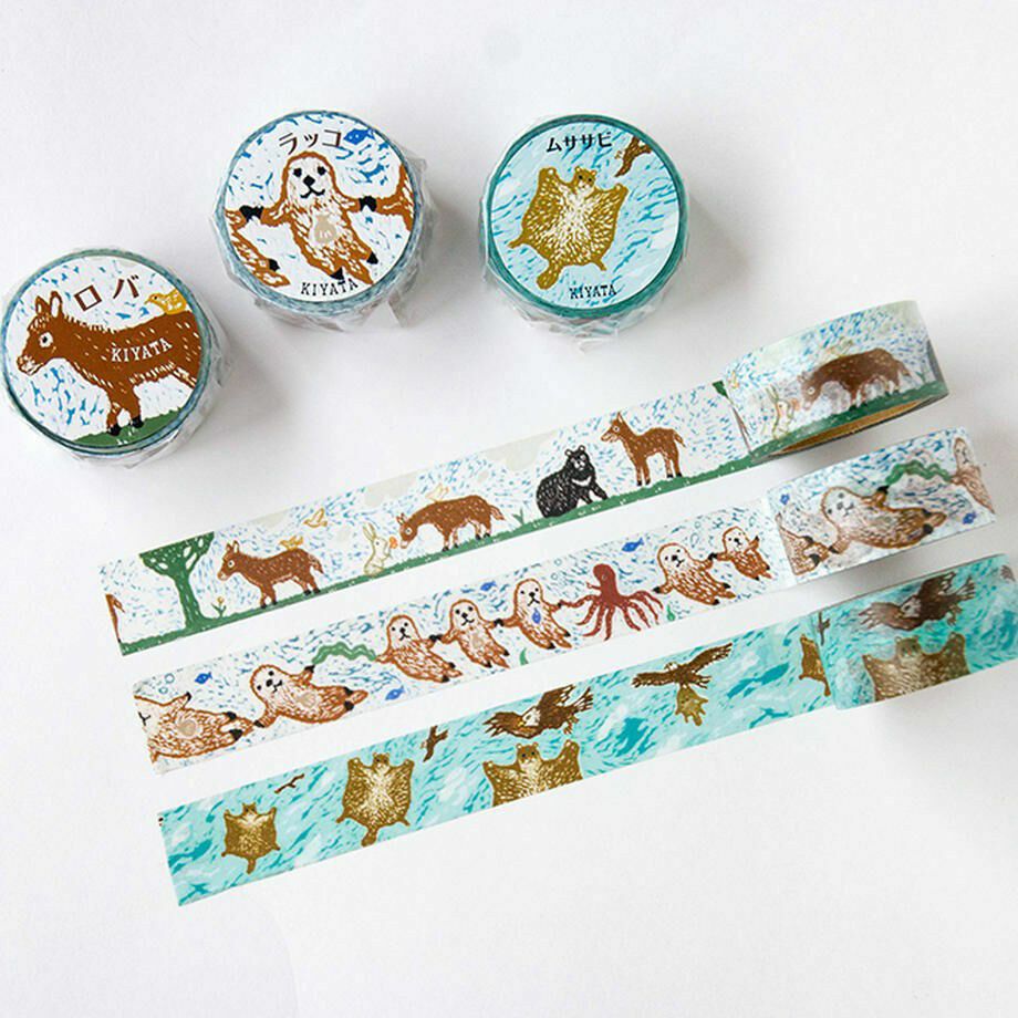 木版画調のイラストは、KIYATAデザインならではの個性にあふれ、素朴で愛嬌たっぷり。たくさん並ぶマスキングテープの中でも、ひときわ異彩を放っています。