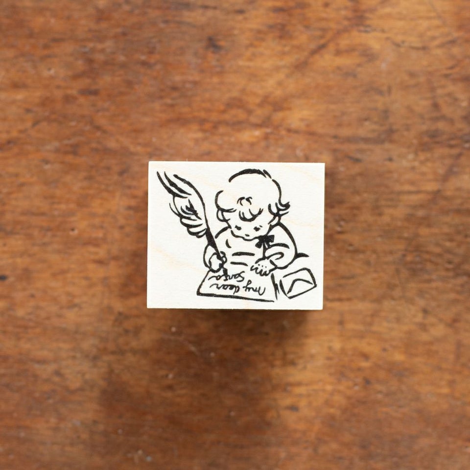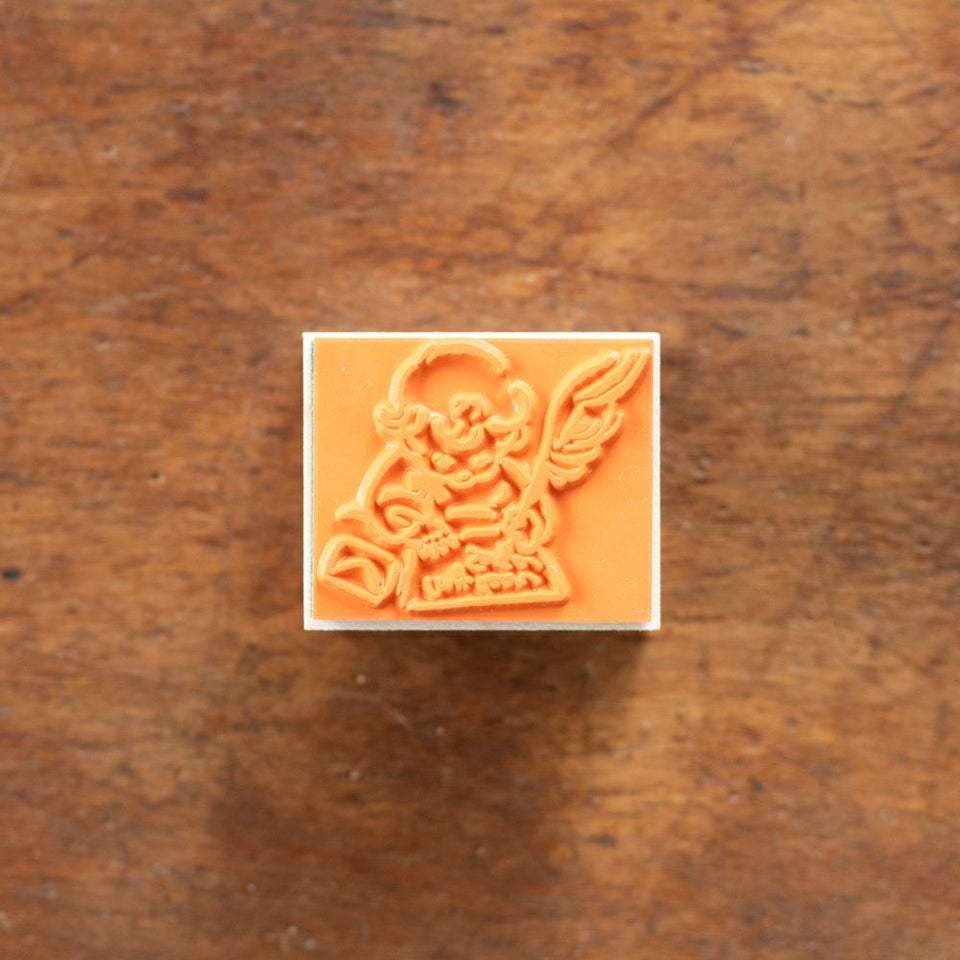 天使が羽ペンでサンタクロースにお手紙を書いているハンコです。