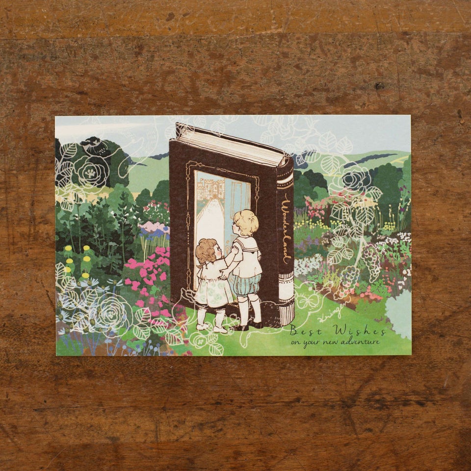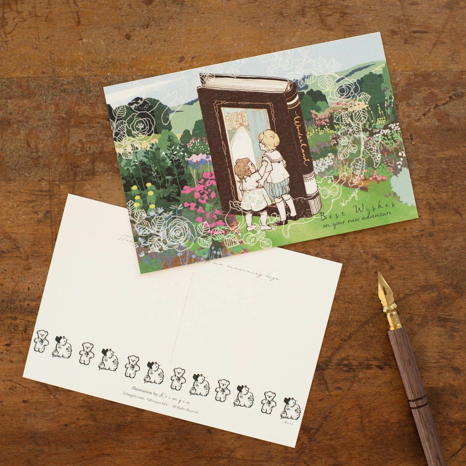 海外の古い絵本を思わせるノスタルジックな画風で子どもや動植物をモチーフに描くKrimgenさん。「鮮やかな英国式ガーデンで物語への扉を開く兄弟たち」というイメージで描かれたポストカードです。