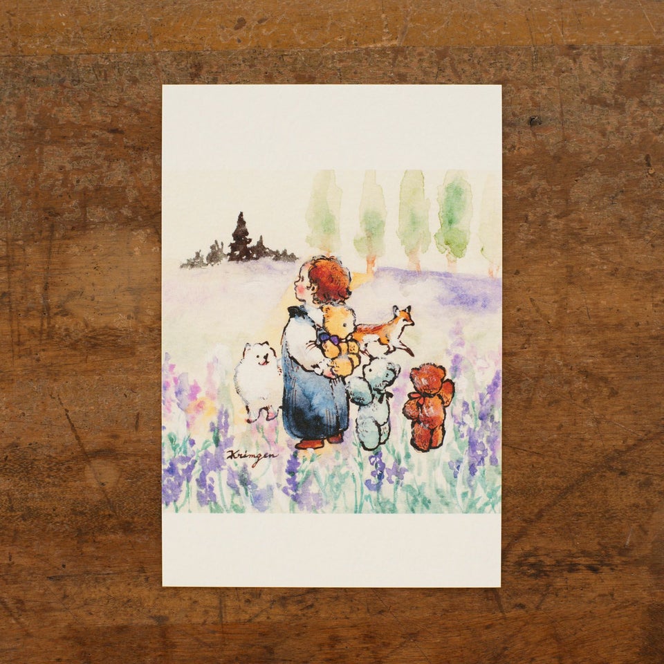 海外の古い絵本を思わせるノスタルジックな画風で子どもや動植物をモチーフに描くKrimgenさん。ラベンダーに包まれて、お友達と過ごす穏やかな時間。優しい色彩で描かれた心安らぐポストカードです。