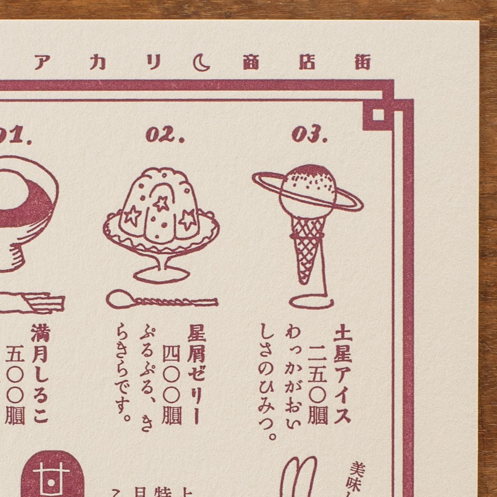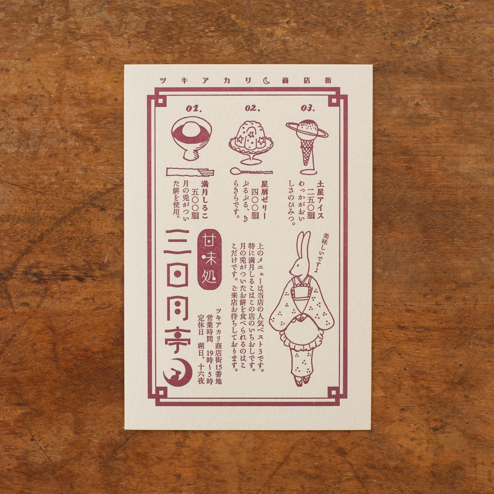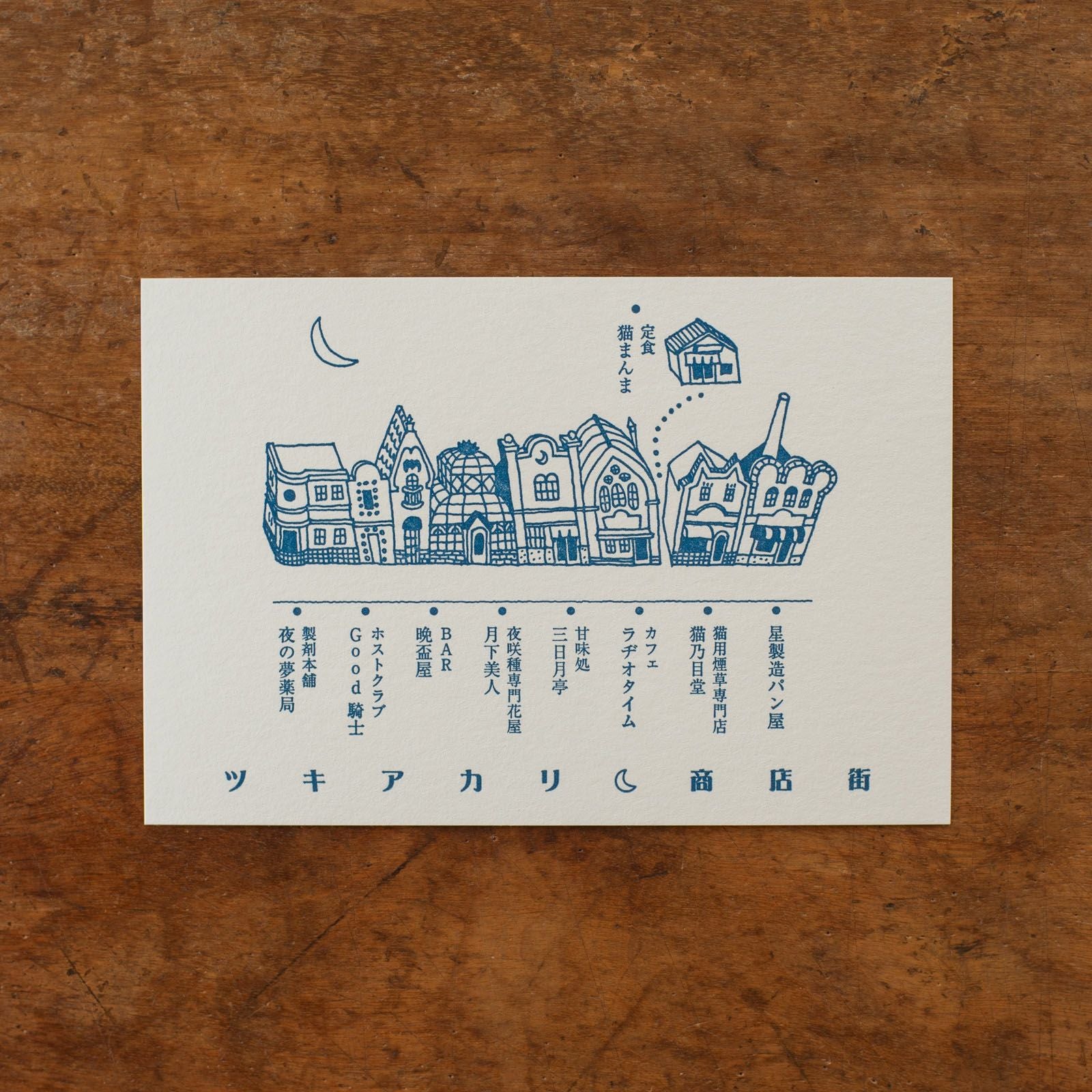 九ポ堂|活版印刷のポストカード「ツキアカリ商店街・三日月亭」