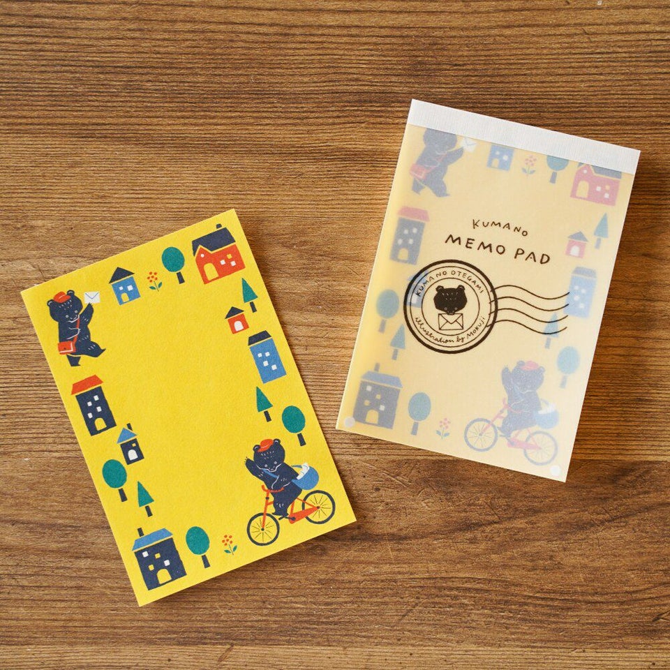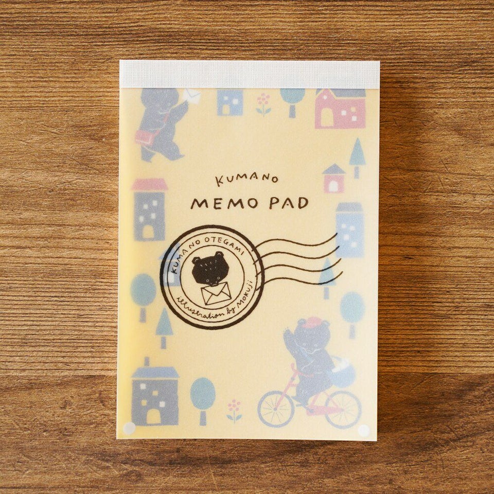 イラストレーター・Mokujiさんが描くクマの郵便屋さんがメモパッドになって登場です。元気をもらえそうな鮮やかなイエローをバックに、一生懸命お手紙を配達するクマさんの姿が描かれています。