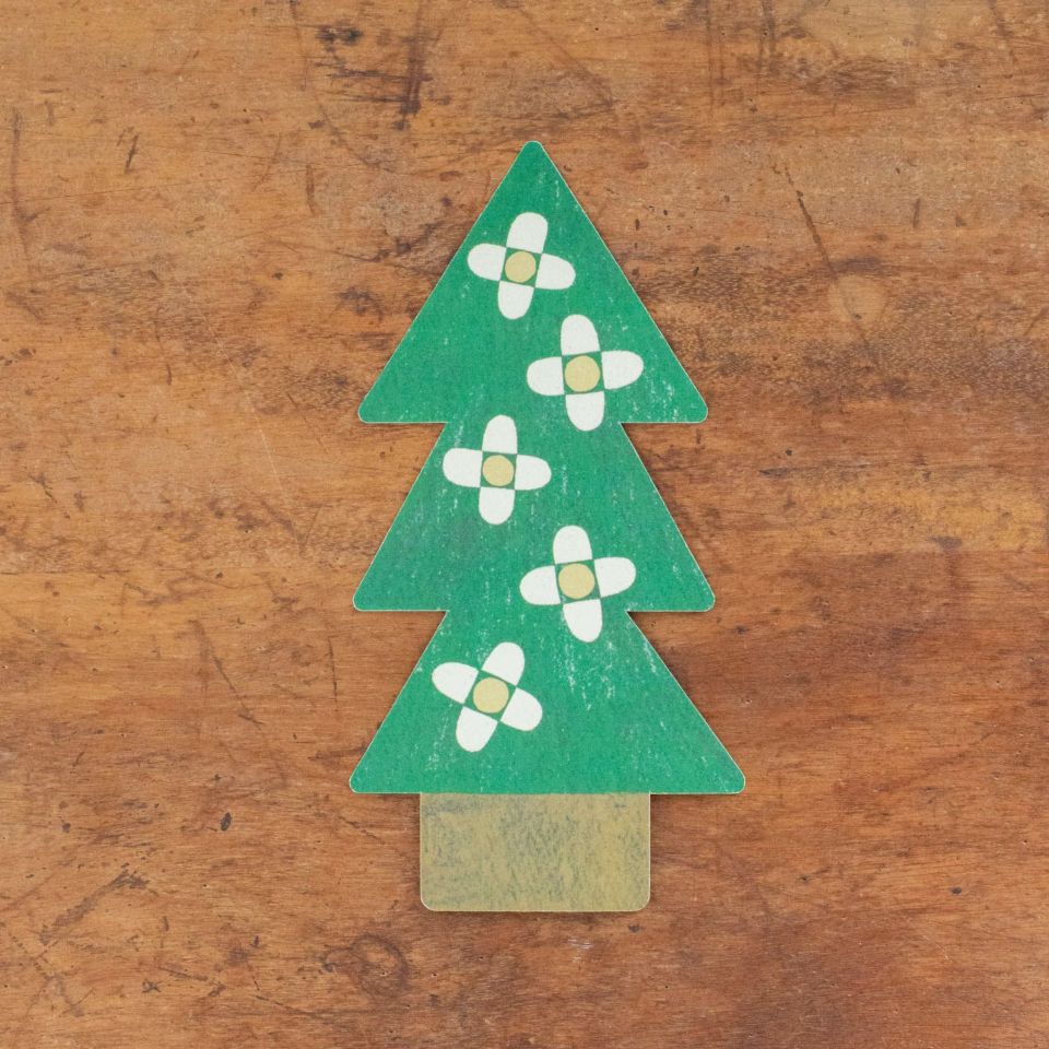 白いお花が咲いている木の形をしたメッセージカード。うら側には果物をくわえた鳥さんが描かれています。