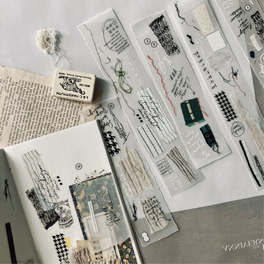 「fabric.」では、さまざまな布の切れ端や糸くず、洗濯表示のタグまで、日常に溶け込む小さな布素材たちにフォーカス。暮らしの質感をそっと閉じ込めたようなデザインで、手ざわりまで感じられそうです。透明感のあるフィルム素材のPETテープは、手帳やノートのデコレーションはもちろん、ラッピングのワンポイントやコラージュにもおすすめ。
