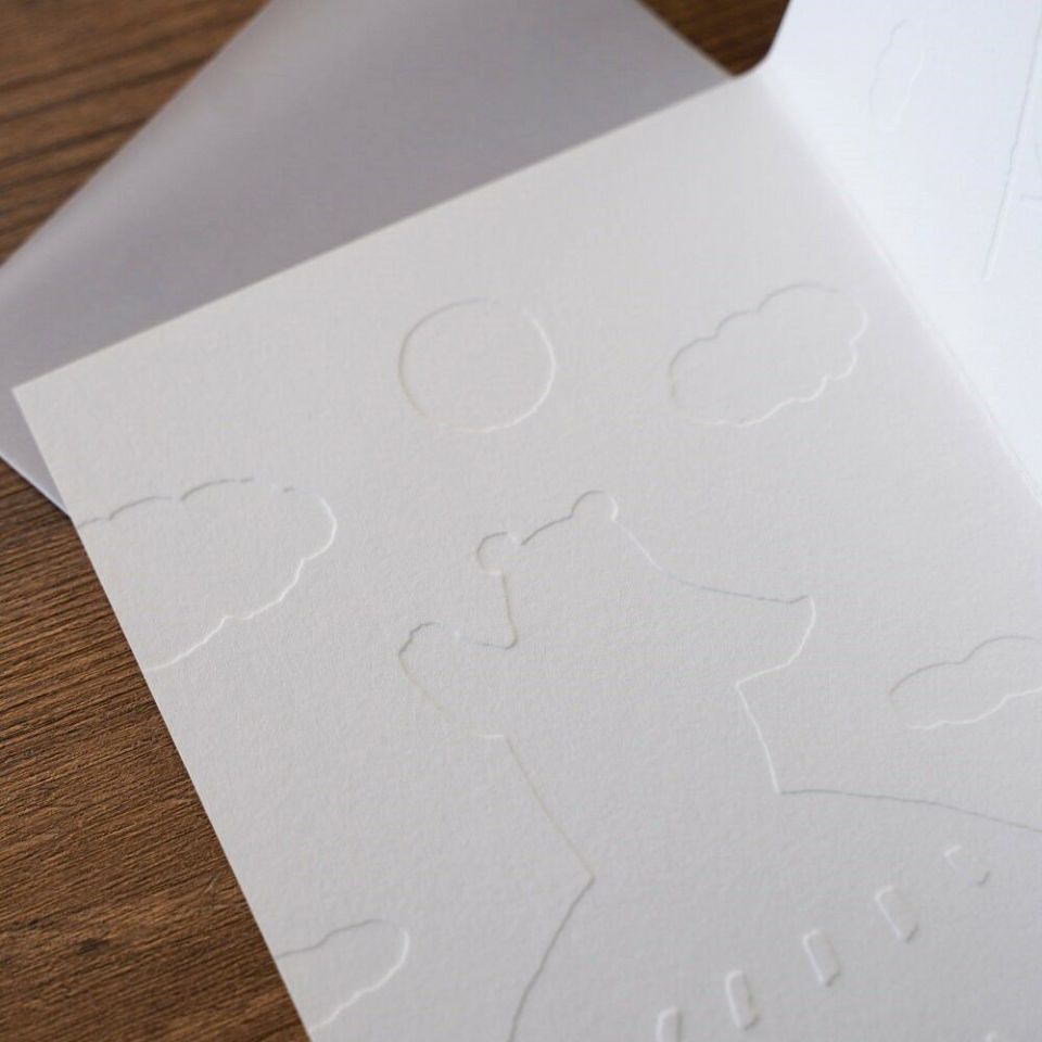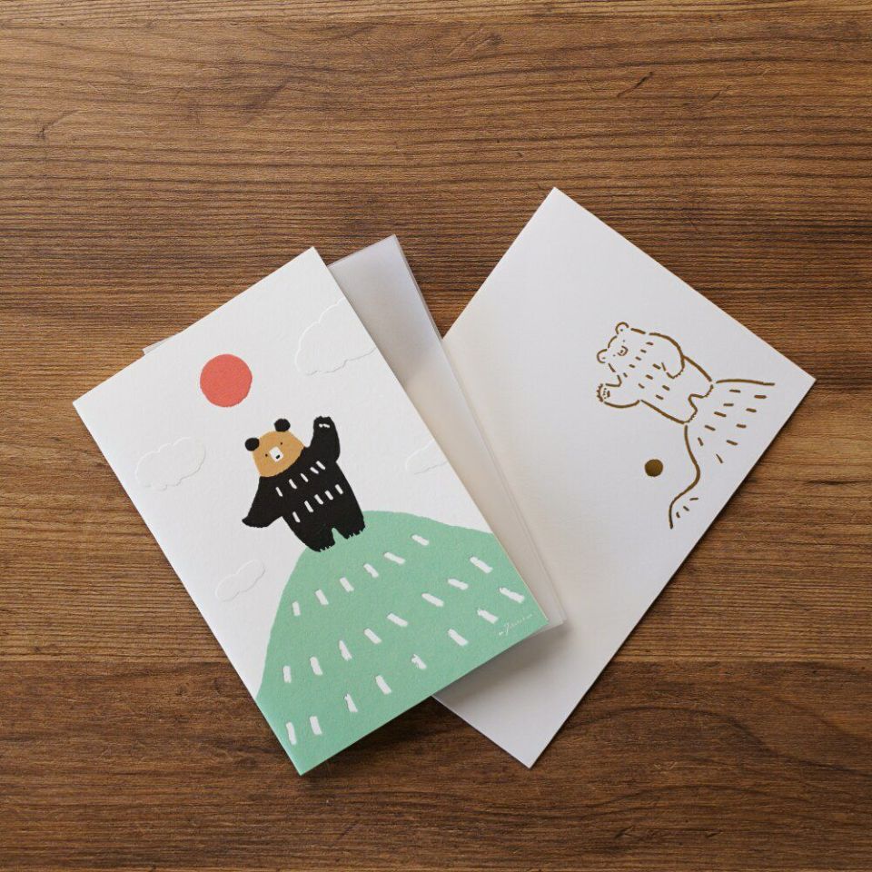 受け取った人は思わず笑顔になってしまいそうな、イラストレーター・高旗将雄のバースデーカード。くまさんが、山の上から大きな声でお祝いしてくれているような、ほっこりかわいいデザインです。カードには、ぽこぽことしたエンボス加工(浮き出し加工)を施しました。