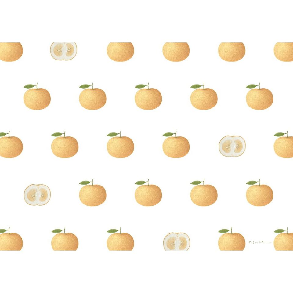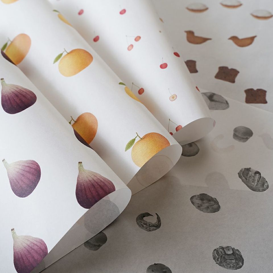 一見「写真かな?」と、見間違ってしまう、繊細で透明感がある作品が印象的な舘野明日佳さん。[切手&ポストカードセット]に続き、包装紙をご制作いただきました。紙の上に、ころころと並ぶ美味しそうな食べ物たち。フルーツのカット面も瑞々しく描かれています。焼き菓子たちは楽しそうに行進しているようなご機嫌なデザインになっています。ちょっとしたお裾分けをする時の紙袋を作ってみるのもいいですね。A3サイズなので、定型封筒を2枚作ることができます。純白ロールという、片面がツヤツヤ、片面がザラザラしている用紙を使用しています。イラストの雰囲気に合わせてツヤ面・ザラ面に印刷しているパターンがあるので、手触り感もお楽しみください。