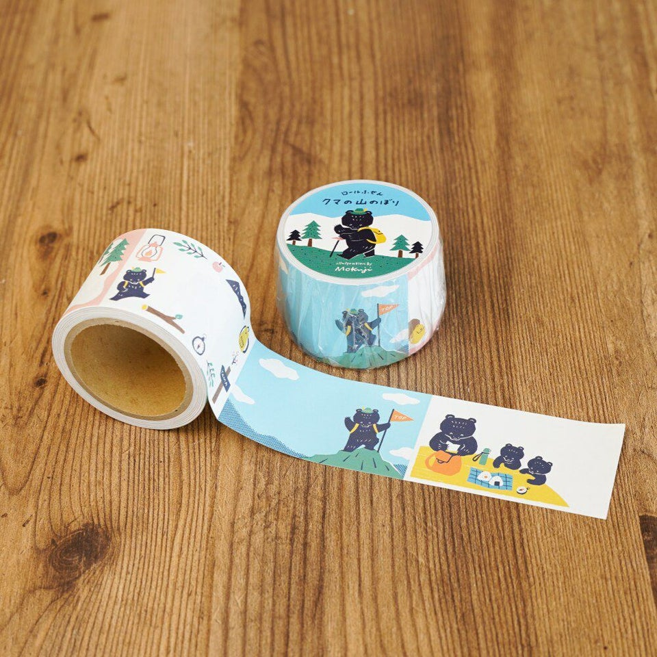 クマ好きさん再び集合! イラストレーター・Mokujiさんのロールふせん・第2弾です。第1弾では、お手紙を楽しむ姿でロールふせんを可愛く彩ってくれていたクマさん。今回は山登りに挑戦です。6柄の中で、準備から登頂までのストーリーが流れます。ちびクマちゃんたちも登場し、より一層賑やかに。きちんと脚を揃えておにぎりを食べる姿・登頂した誇らしげな姿など、なんとも愛おしい気持ちにさせてくれます。ピリッと気持ちよくちぎれ、全面糊仕様でしっかりくっつきます。一度使ったらやみつきになる使い心地のロールふせんと一緒に、素敵な紙もの生活をお過ごしください!