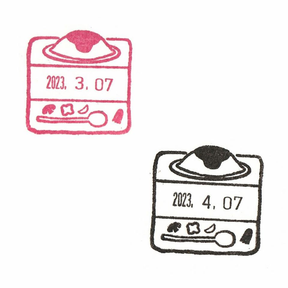とみこはんの「おいしいスタンプ」シリーズ。みんな大好き、オムライスの絵柄の日付印です。赤いインクで押すと、いっそうケチャップ感が増すのでぜひお試しを。