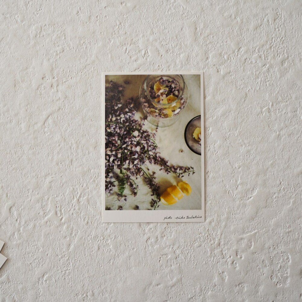 「桜の花が終わると牡丹や藤が咲き始めて少しずつ初夏の気配を感じます。咲き誇る藤の花があまりにも美しくて、檸檬と一緒に瓶に詰めて藤の色と香りのシロップを作った時の風景をカードにしました。爽やかな風と香りも届きます」