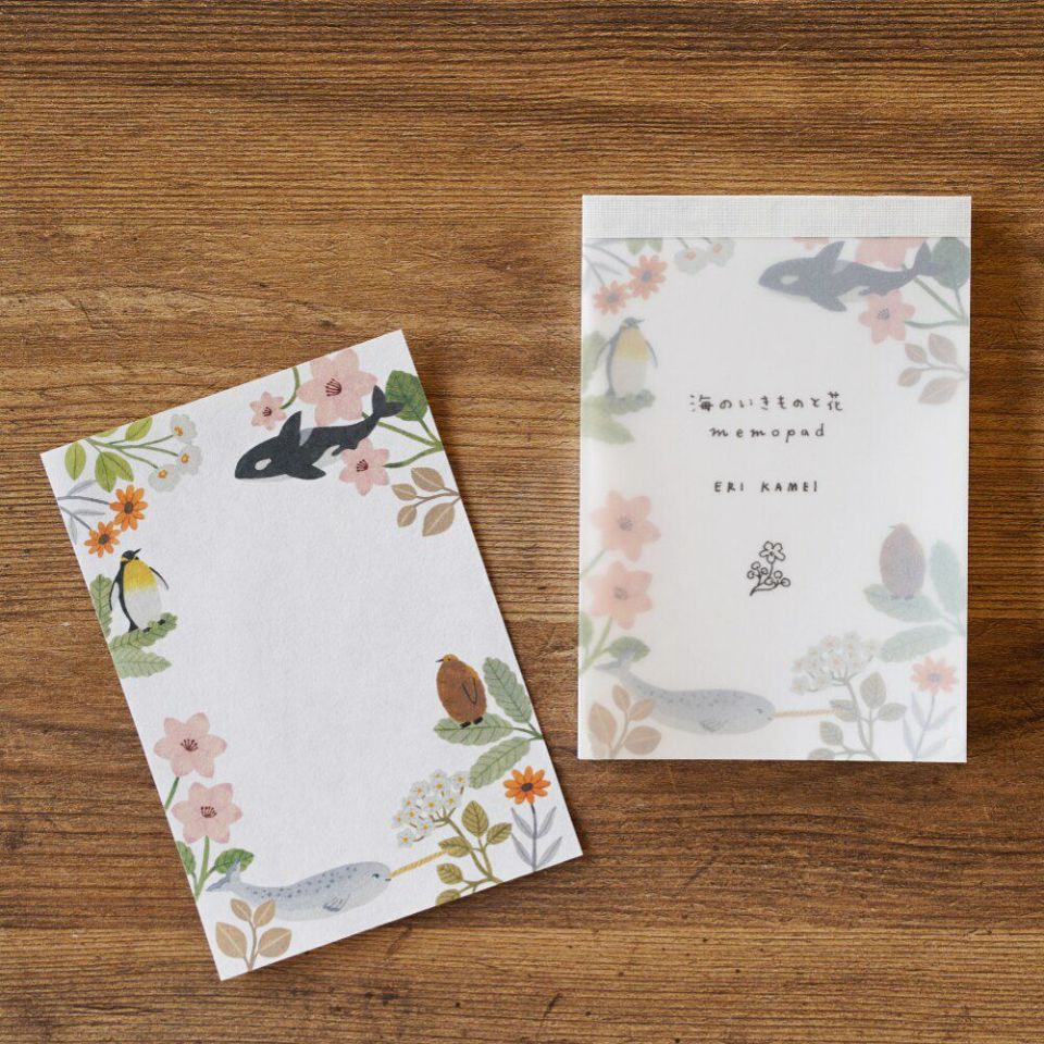 広告や雑貨、CM・パッケージなど、幅広い分野でご活動中の亀井英里さん。海のいきものとお花という、少し珍しい・でも絶対に可愛い組み合わせをテーマに新作メモパッドをご制作いただきました! 葉っぱの上のペンギン親子や、スイスイ泳ぐシャチとイッカクが、お花たちとベストマッチ!トレーシングペーパーの表紙に書かれた亀井さんの手書き文字も可愛く、重なった際の透け感もお楽しみ下さい。少しざらざらした風合いのある紙を使用しています。お揃いのロールふせん・マスキングテープも新登場しておりますので、ぜひご覧下さい。