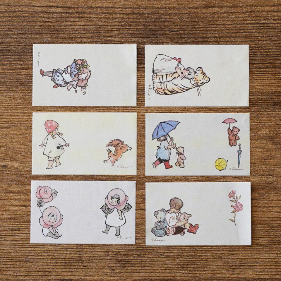 その仕草・表情のひとつひとつに、思わず笑みがこぼれてしまいそうな子どもたちと動物たち。バラのかぶりものちゃんたちの愛らしさがたまりません! 6種類のデザインの中に、縦型・横柄があるので使い勝手も抜群です。背景も優しい色味なので、暮らしやオフィス使いにもなじむデザインです。ToDoを書いてデスクやパソコン周りに貼ったり、先の予定を書き込んで手帳に貼ったり。工夫次第でいろいろ楽しんでくださいね。
