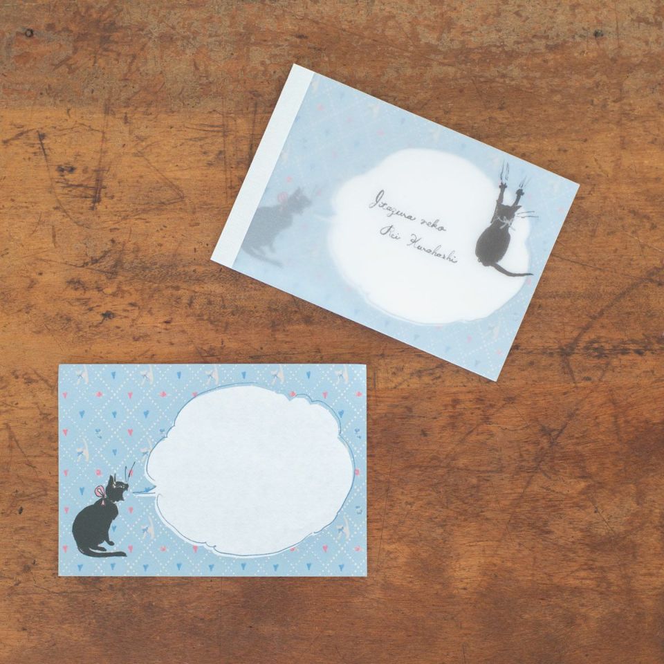 メモパッド「いたずらねこ」では、ピンクのリボンがキュートな黒猫が、なにやらおしゃべりをしています。水色の背景の中には白猫が、トレーシングペーパーの透ける表紙にも、黒猫が…!