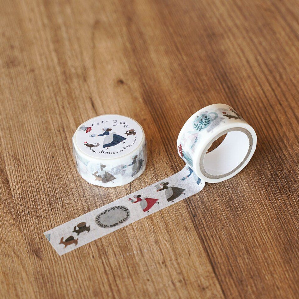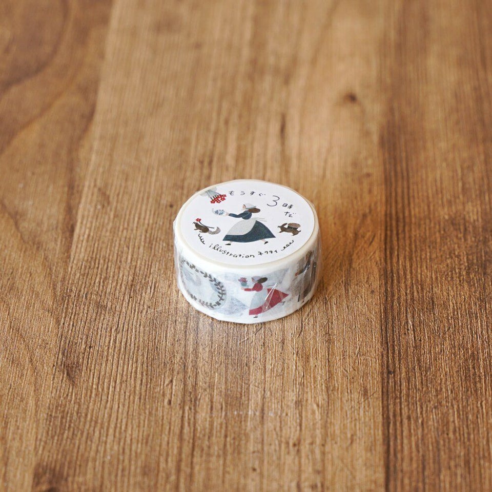 北海道札幌市を拠点に紙雑貨や絵本などを手がける、のりおさん&あさみさんによるイラストレーターユニット・ネクタイと制作したマスキングテープです。時刻は14時44分。みんな大慌てでおやつの準備に取り掛かる様子が描かれています。