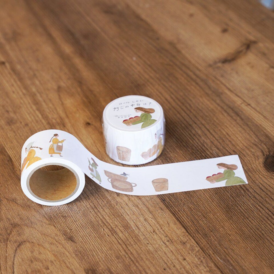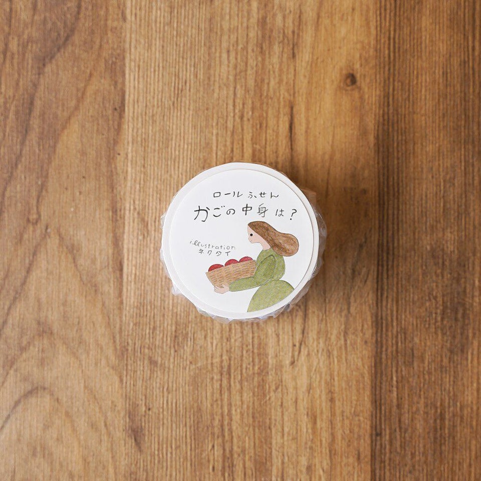 北海道札幌市を拠点に、紙雑貨や絵本などを手がけるイラストレーターユニット・ネクタイと制作したロールふせん。かごに入った何かを運ぶ少女や、かごから少しはみ出した頭が気になるうさぎなど、かごを取り巻く6つのシーンが描かれています。かごの中身は何でしょう?