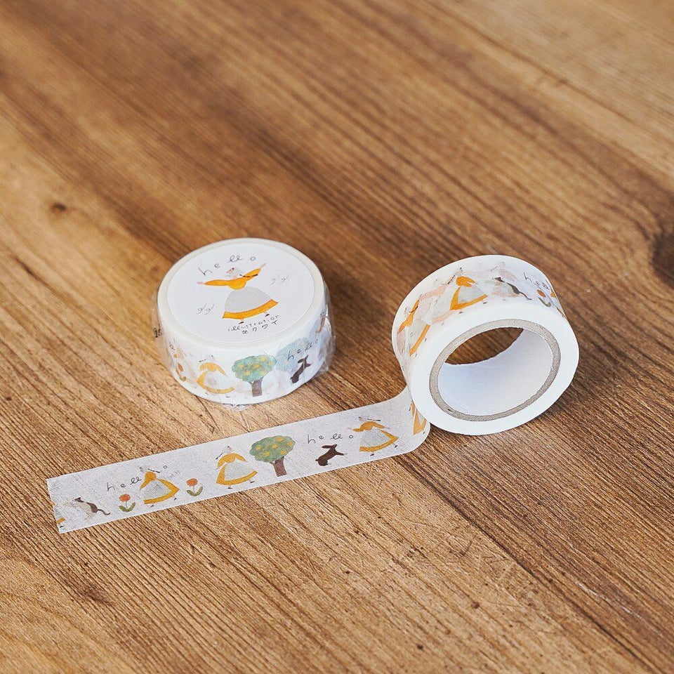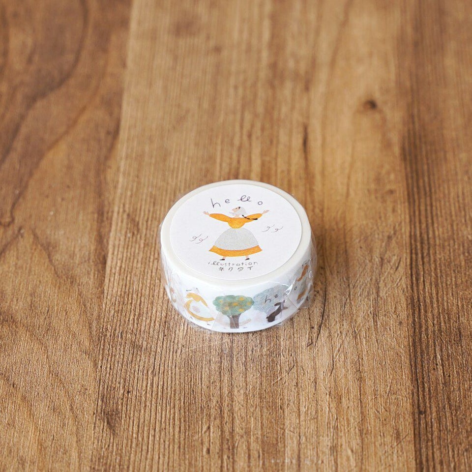 北海道札幌市を拠点に、紙雑貨や絵本などを手がけるイラストレーターユニット・ネクタイと制作したマスキングテープ。太陽や風、ねこ、うさぎ、レモンの木、道端のお花にも元気に「hello」。手紙社の雑誌『LETTERS』の創刊に合わせて、ネクタイが描きおろしてくれた「ハローさん」です。