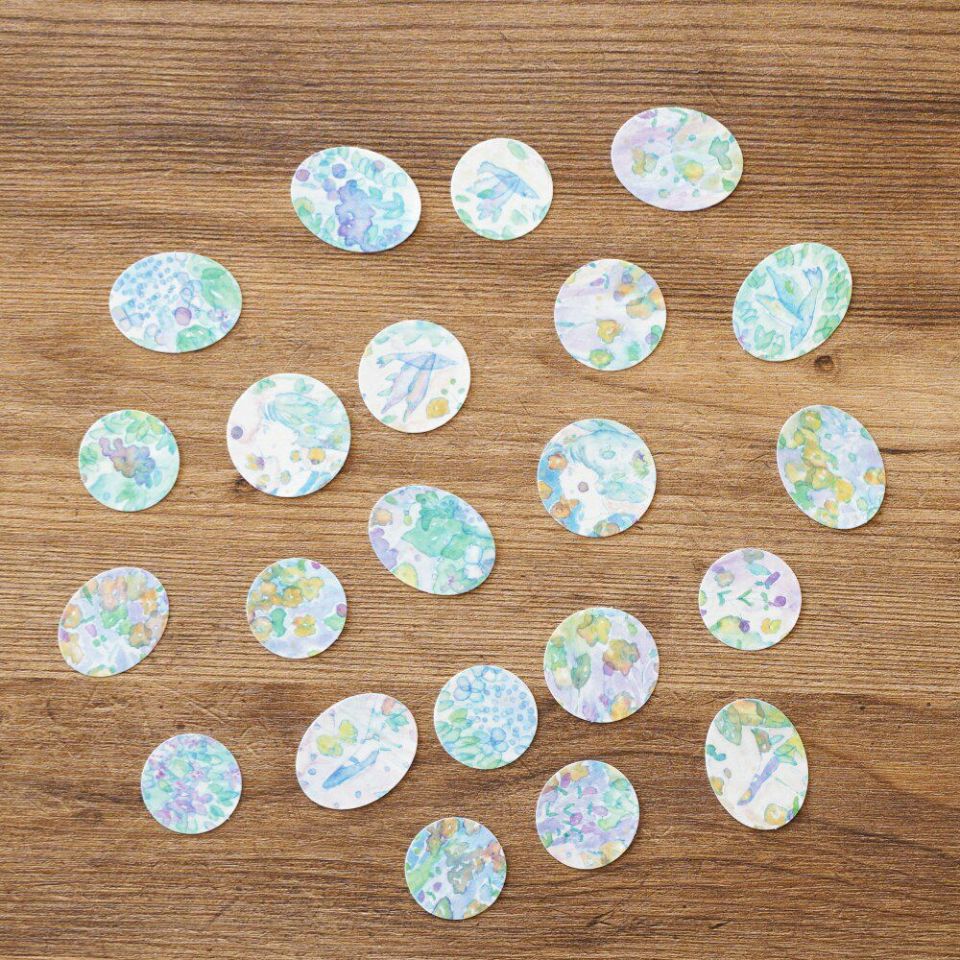 透明感のある色彩で、季節を運ぶ風や植物の香り、気持ちの変化などの目に見えないものを描き出す清水美紅さん。自分もその世界に入り込んでいるような気持ちになります。画材はアクリルガッシュ(水性アクリル絵具の一種)を使用されているとのこと。作品の一部分が、丸と楕円のカケラになってこぼれ落ちたかのようなフレークシールです。よくよく見ると、横顔や靴、鳥などのモチーフも。1枚1枚切り離されているので使い勝手も抜群で、手帳の隙間も素敵に彩ってくれるシールです。すべて柄違いの22枚セット! 和紙シールの柔らかな透け感もお楽しみいただけます。