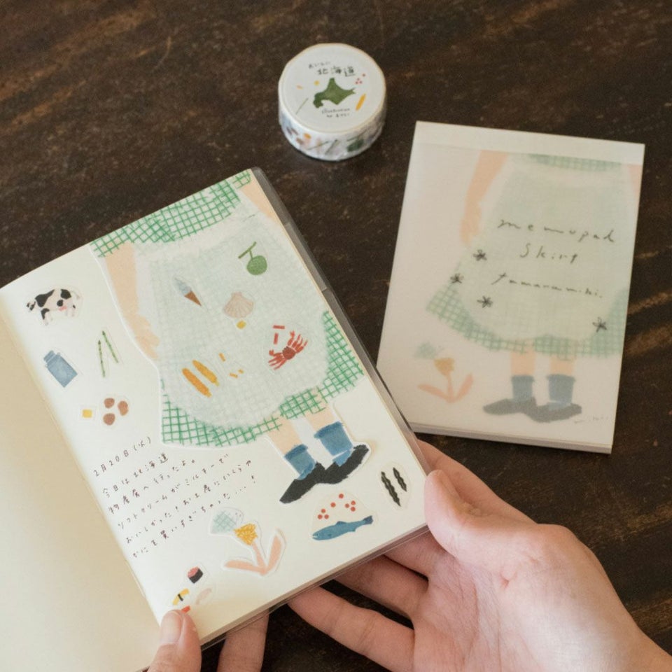 マスキングテープちぎり絵作家であり、イラストレーターでもある田村美紀さん。作品の中でも人気のある「足元さん」シリーズ、ファンの方も多いのでは…!? 今回ご制作いただいたデザインは、女の子の憧れ・チェックのスカートにエプロン姿の足元さん。お花では、ちょうちょが羽休めをしています。おしゃれな差し色ソックスもポイント。記入部分は、少しザラザラとした風合いのある紙を使用しています。