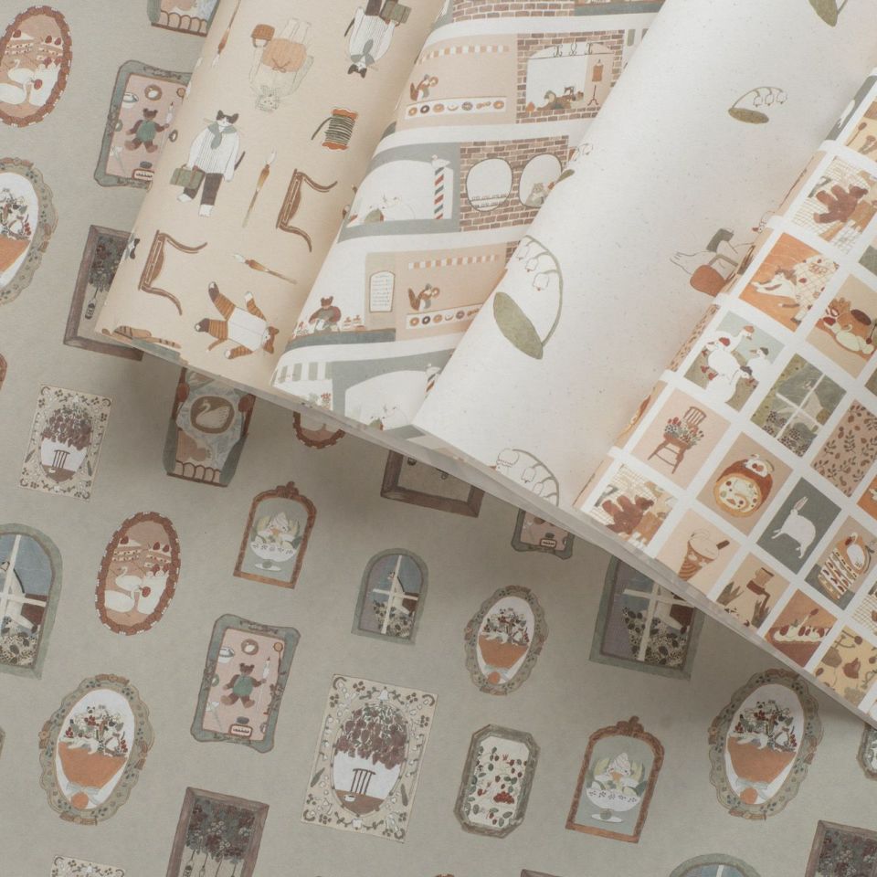 手紙社オリジナルグッズ初登場のイラストレーター・トビマツショウイチロウさんの包装紙は、ロールふせんやフレークシールとお揃いで使えるデザインです。色々な動物たちや美味しそうなおやつがトビマツさんらしい落ち着いた色合いで描かれています。細部まで細やかにデザインされているので、一柄一柄じっくり見入ってしまいそう。お菓子のお裾分けを包んだり、モチーフを切り取って手帳デコを楽しんだり、ぜひお好きな使い方で楽しんでみてくださいね!