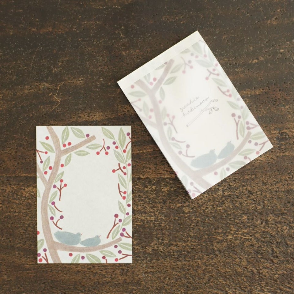 イラストレーターとして、書籍の装幀や広告ビジュアルなどで活躍する柿本芳枝さん。散歩がお好きという柿本さんが、その途中で見つけた心惹かれたモチーフを描いた作品です。赤い実がかわいい木の枝で、羽休め中の2羽の様子が微笑ましいデザインです。表面はざらっと・裏面はつやつやした風合いの用紙を使っています。