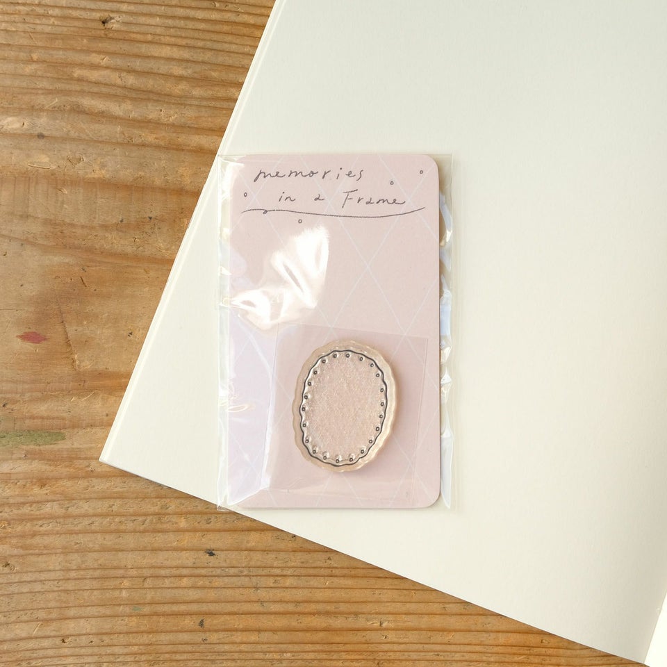 「Memories in a frame - frame」は思い出の風景をテーマにしたクリアスタンプのシリーズ。日々の小さな瞬間や心に残る景色を、一つひとつ大切に額に収めたいという想いが込められています。「small lace oval」は、レースをイメージしたデザイン。フレームの中に小さなスタンプを押して組み合わせるのはもちろん、ちょっとしたイラストやメッセージを添えるのもおすすめです。