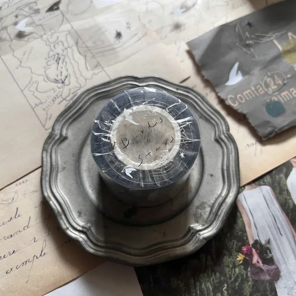 「Birds & Star PET」に描かれているのは、翼を広げて星々の間を駆け抜ける鳥たち。流れ星や光の軌跡が輝くイラストは、まるで宇宙を閉じ込めたかのようなデザイン。フィルム状のPETテープは透明性が高いので、重ねて貼ったり、切り取ってシールのように使ったりするのもおすすめ。くるくるとロール状に10mも巻かれていて、たっぷり使えるのも嬉しいポイント。手帳やノートを彩るのはもちろん、ラッピングの仕上げにも!