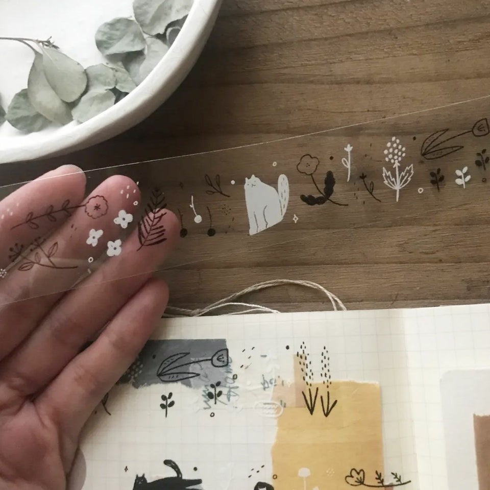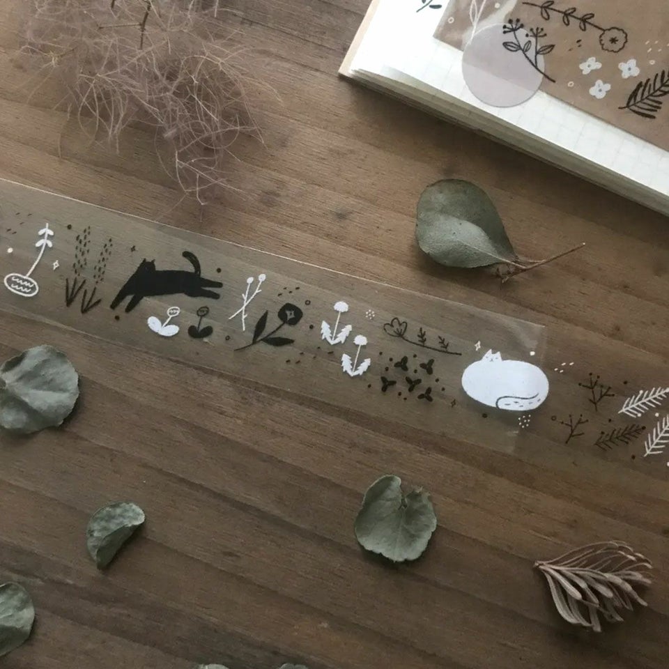 「Twilight cat and flower PET」は、愛らしい猫と花々が煌めく星のように散りばめられたデザイン。フィルム状のPETテープは透明性が高いので、重ねて貼ったり、切り取ってシールのように使ったりするのもおすすめ。くるくるとロール状に10mも巻かれていて、たっぷり使えるのも嬉しいポイント。手帳やノートにデコレーションすれば、開くたびにときめきがあふれます。